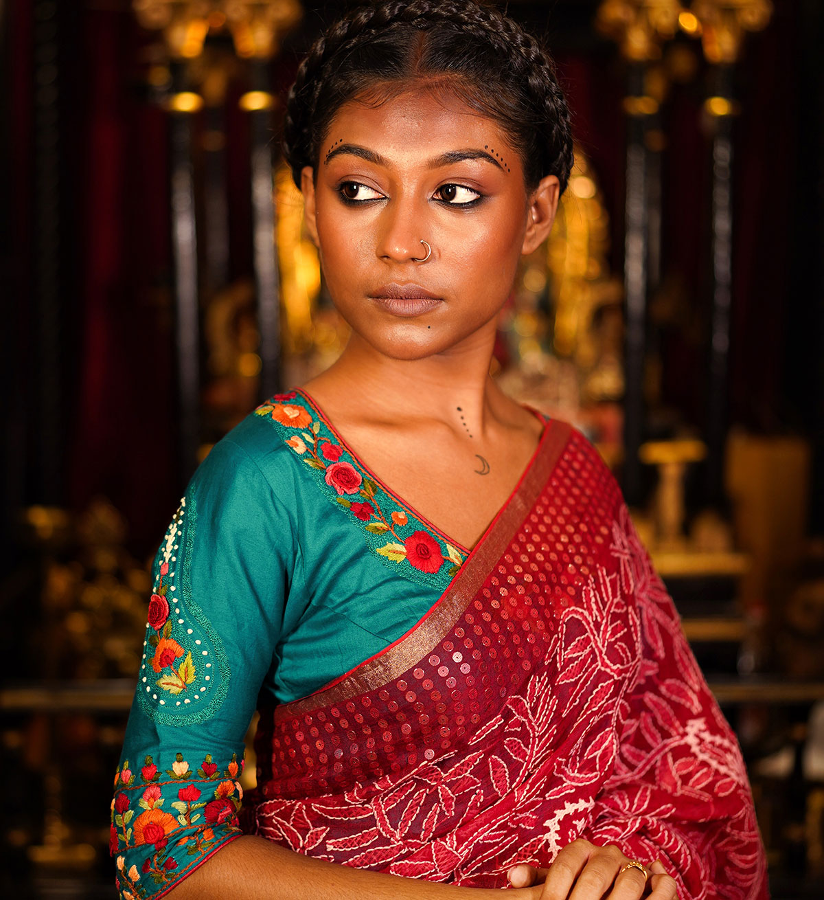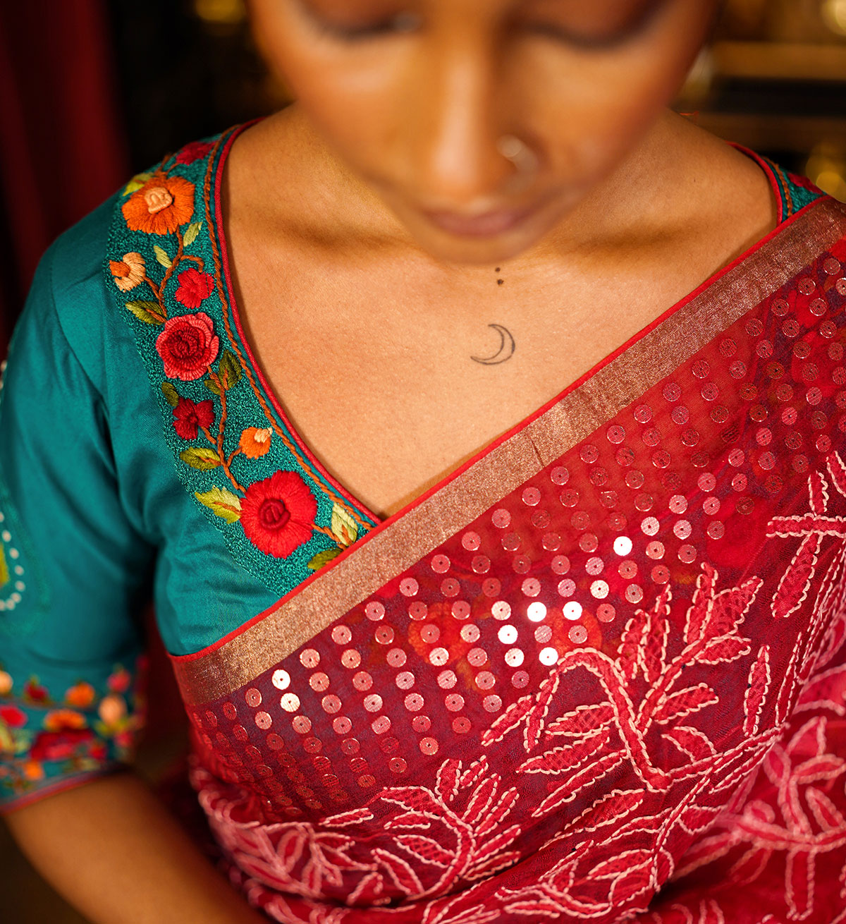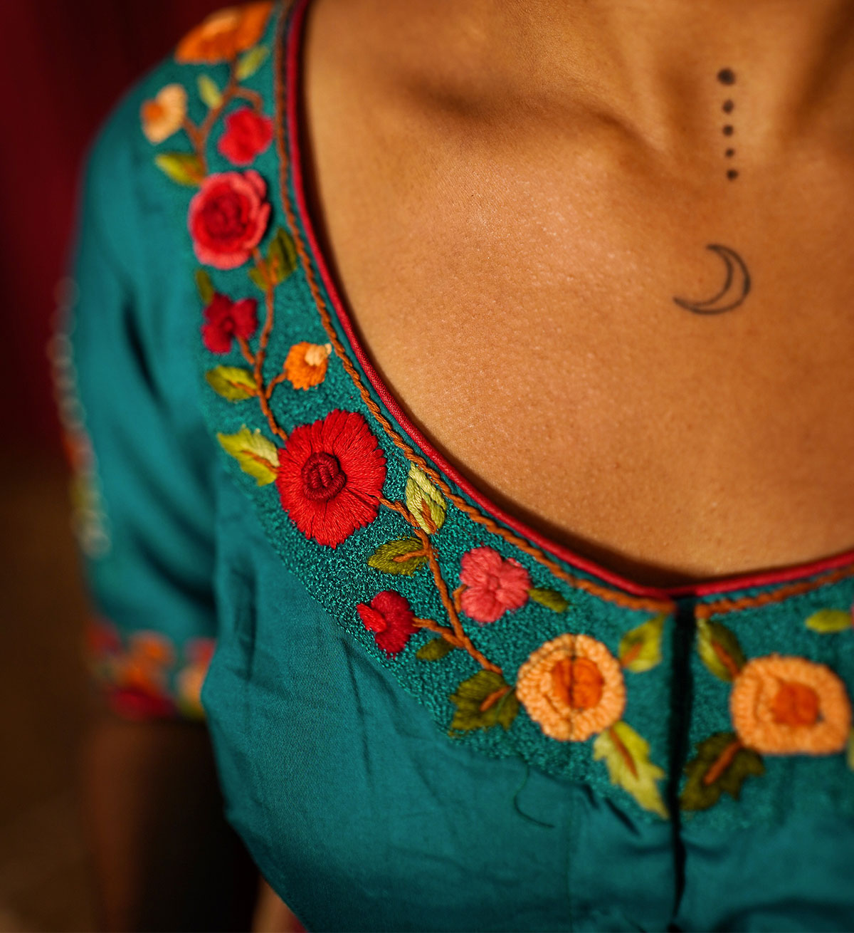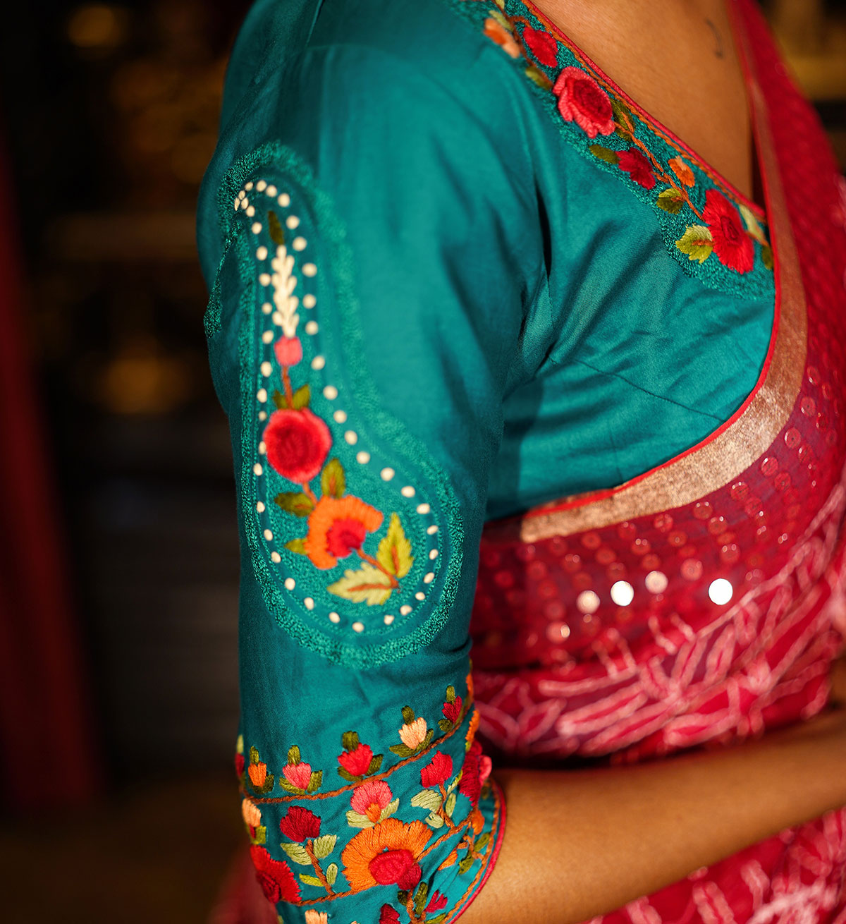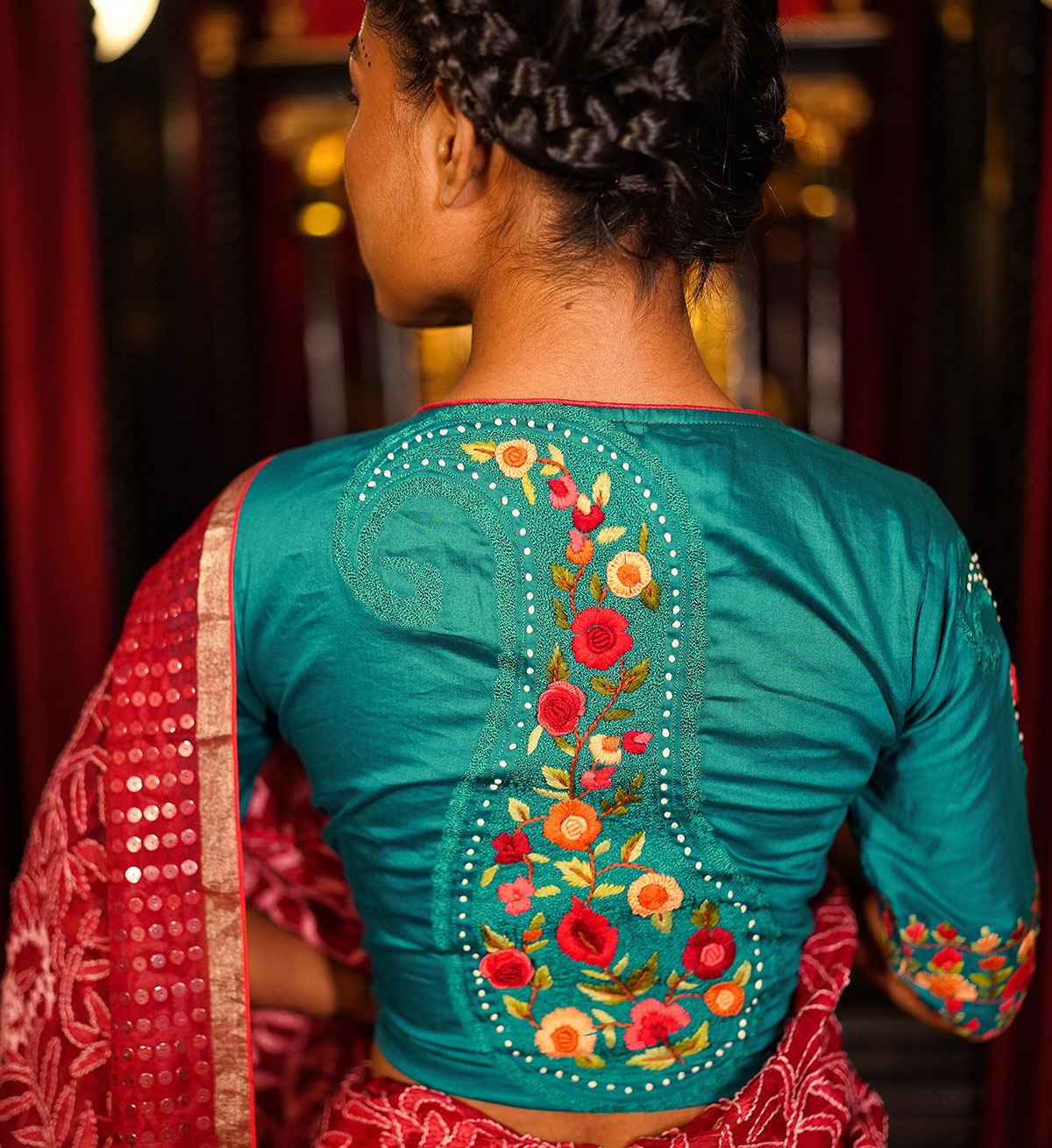 Rich, peacock green blouse in the softest silk cotton, generously adorned with heavy floral embroidery all over! Complementing it is a classic round neckline adorned all along with borders of multi floral embroidery, while the elbow length sleeves come adorned in large hand embroidered paisley motifs. Further detailing is followed into the back of the blouse, accentuated by a large paisley motif filled with floral embroidery done to meenakari precision- making this blouse a classic beauty to behold!