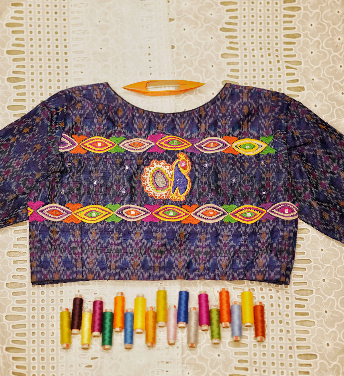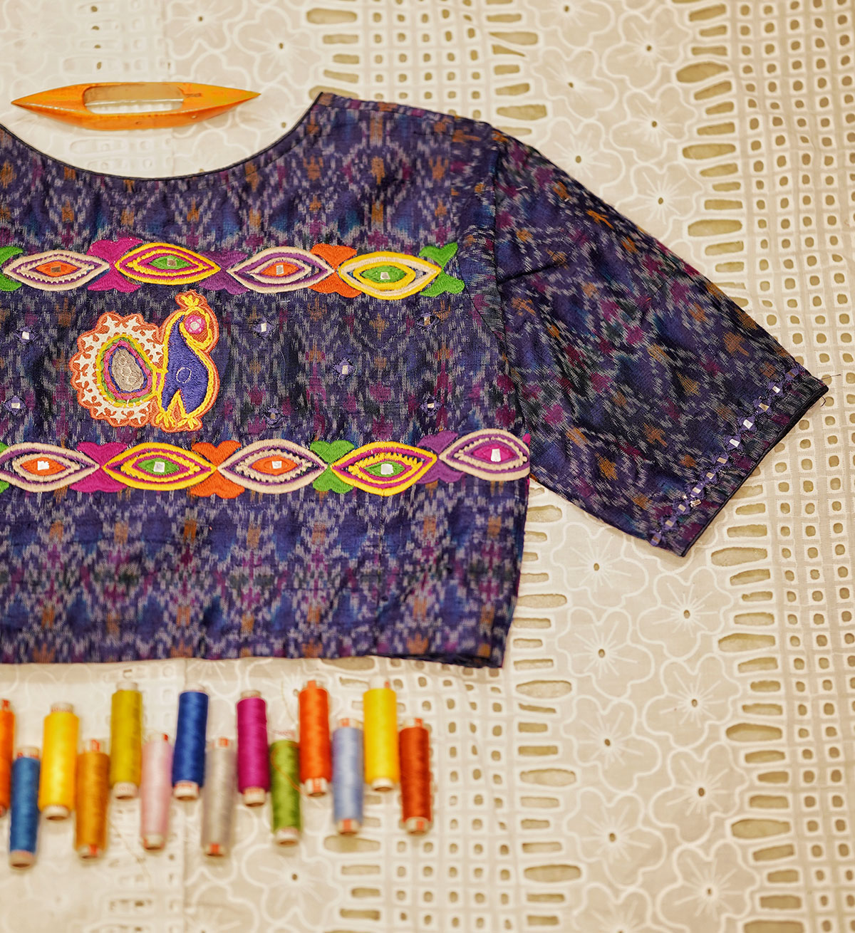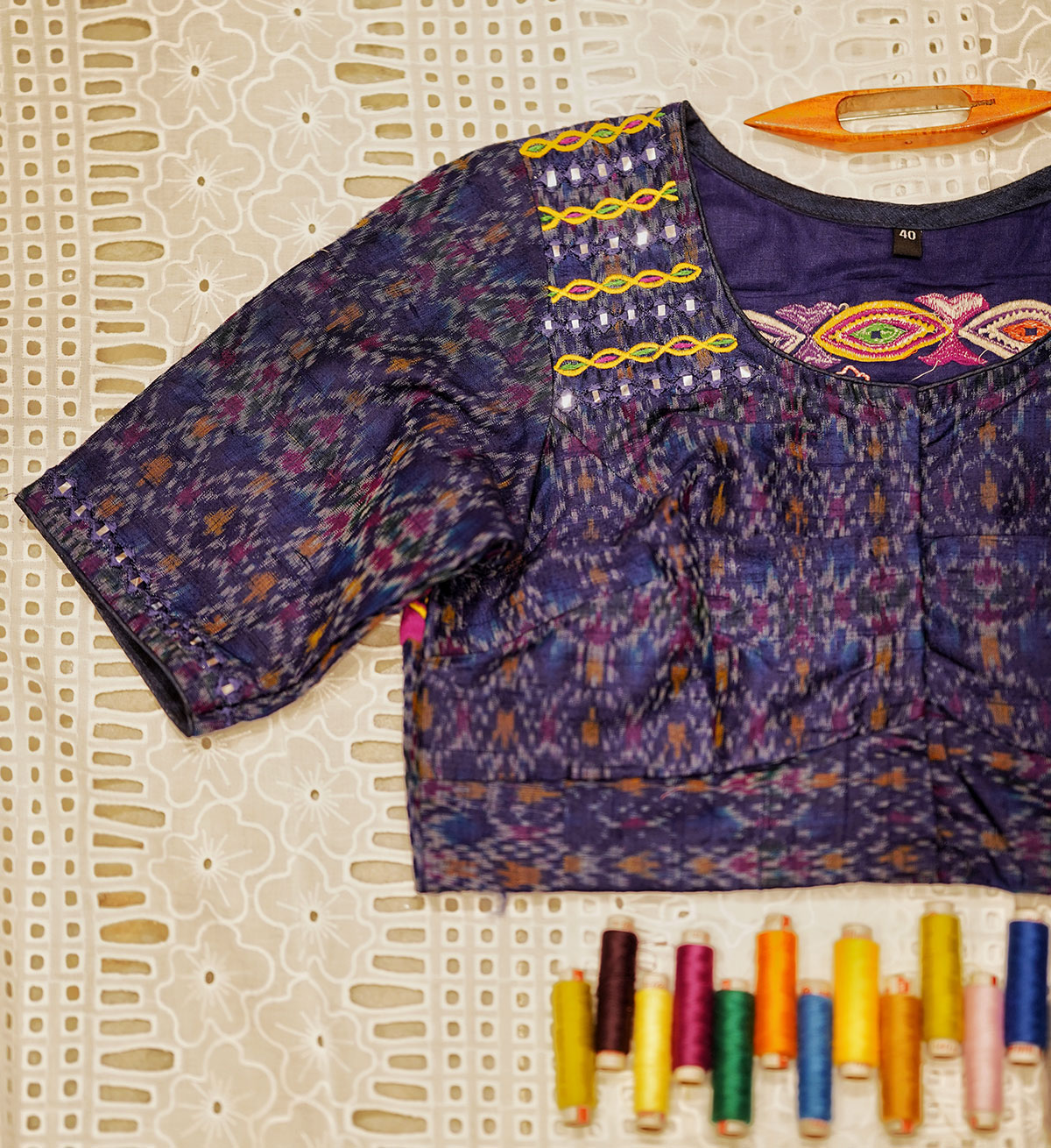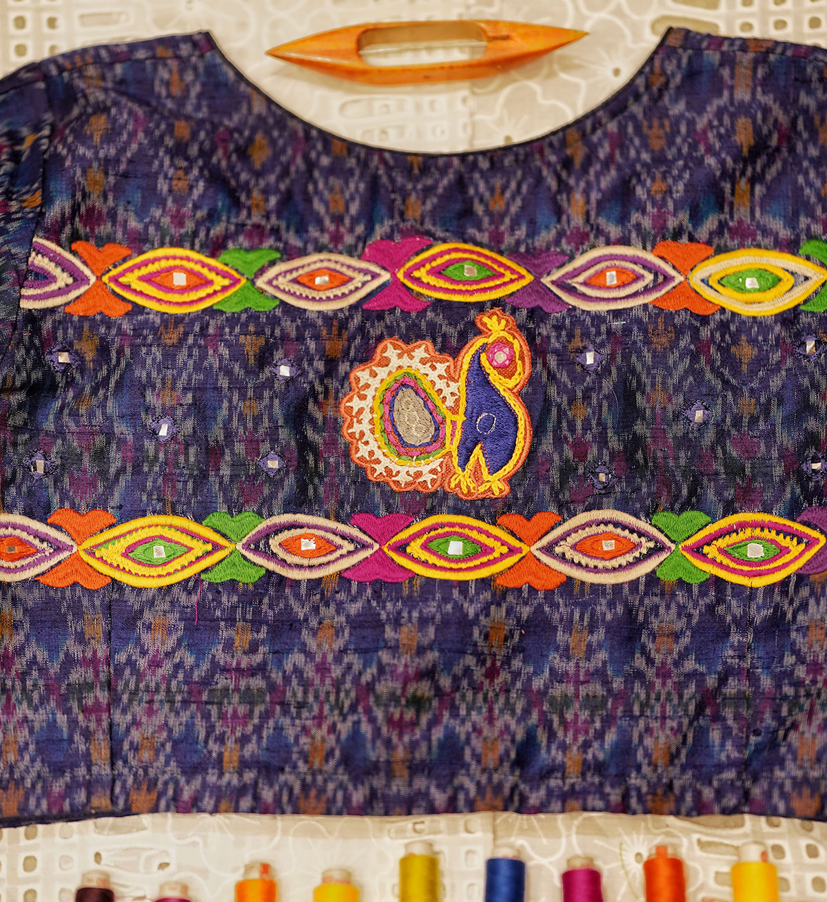 A dreamy piece crafted out of pure silk ikat, in shades of blue, enhanced by multi coloured embroidery and mirror detailing all over the back, front neckline and sleeve hems.The motifs of the embroidery is inspired from the traditional, tribal artform of ‘Rabari’ embroidery, and is our humble tribute to this ancient craft from Kutch, Gujarat.