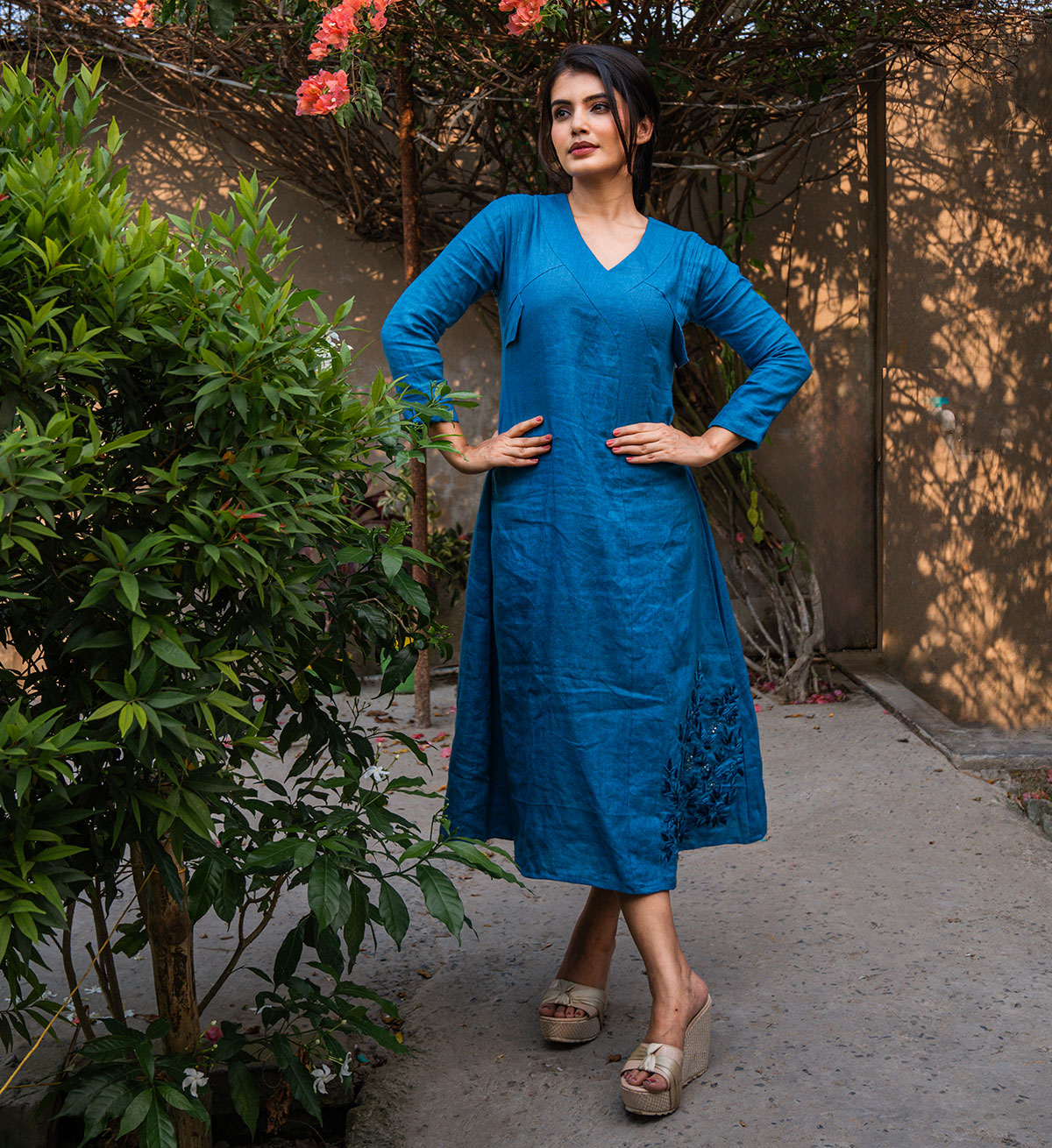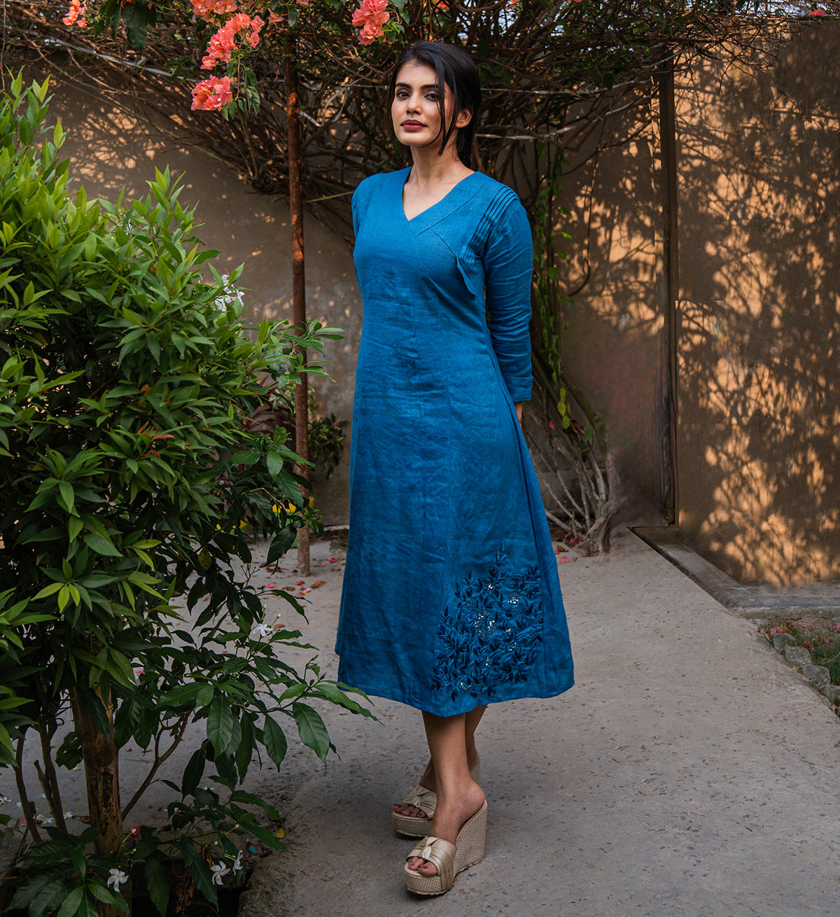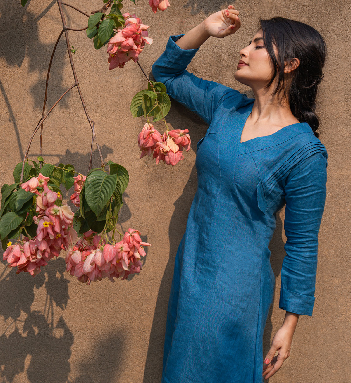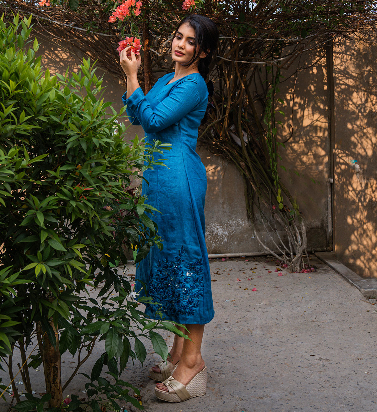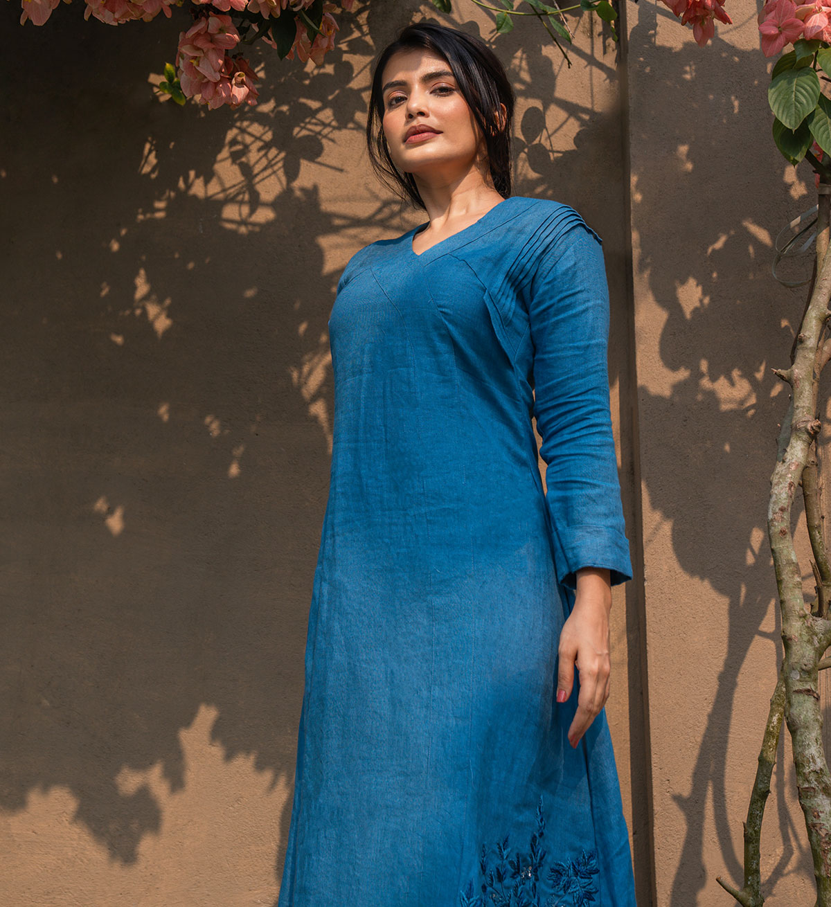 A dress crafted out of colours borrowed from conversations of the clouds and the sky – tailored out of soft, handwoven linen, in an easy fit, with cross over neckline, and pleats and flaps that play around it; further enhanced by tone on tone hand embroidery along one corner of the hemline.