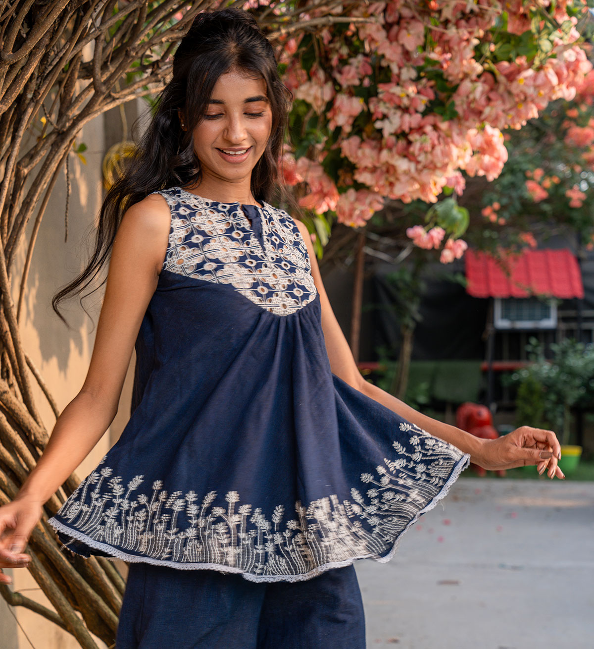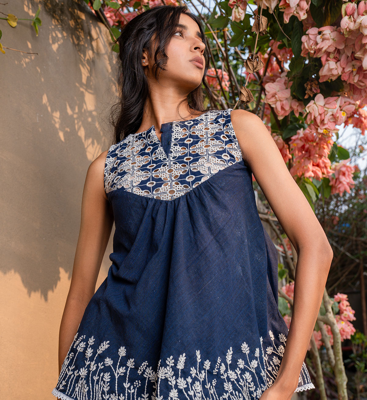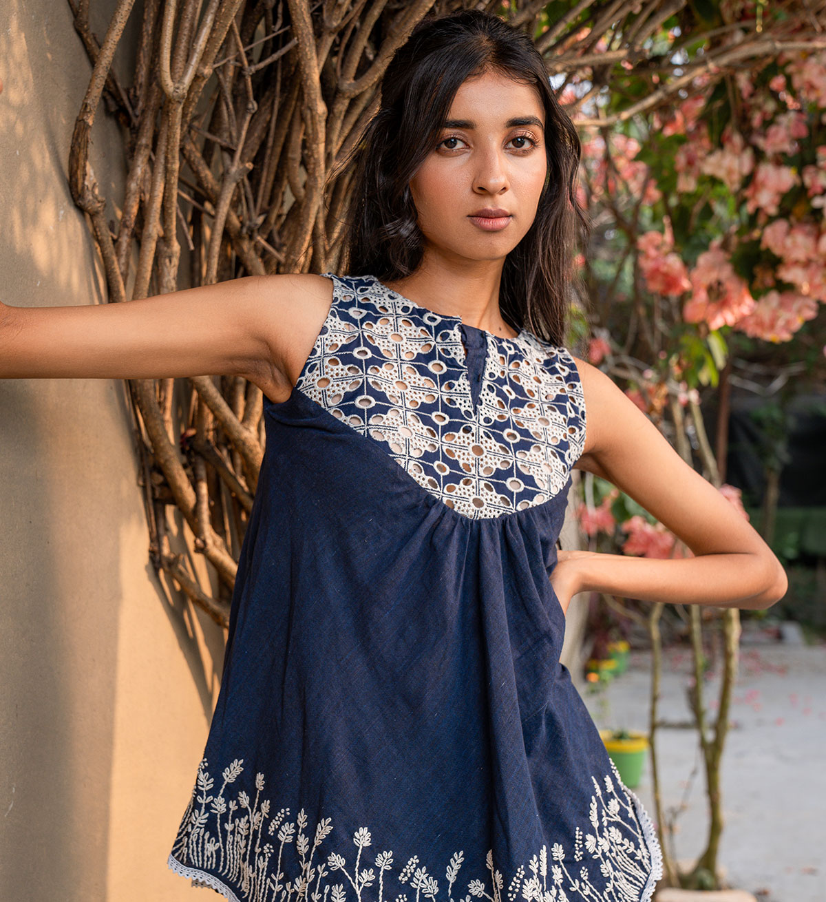 A top meant to be playful and functionally chic all together- tailored to a flary silhouette, out of denim blue cotton, with cutwork embroidery along the front and back yoke, with hand embroidered floral vines are placed carefully all over the hemline. Paired here with our flary overlapping pants that come accentuated with hand embroidery. Can be purchased as seperates as well as a set!