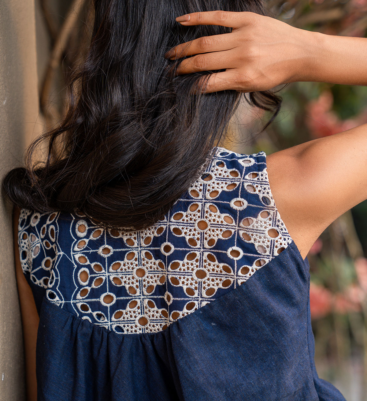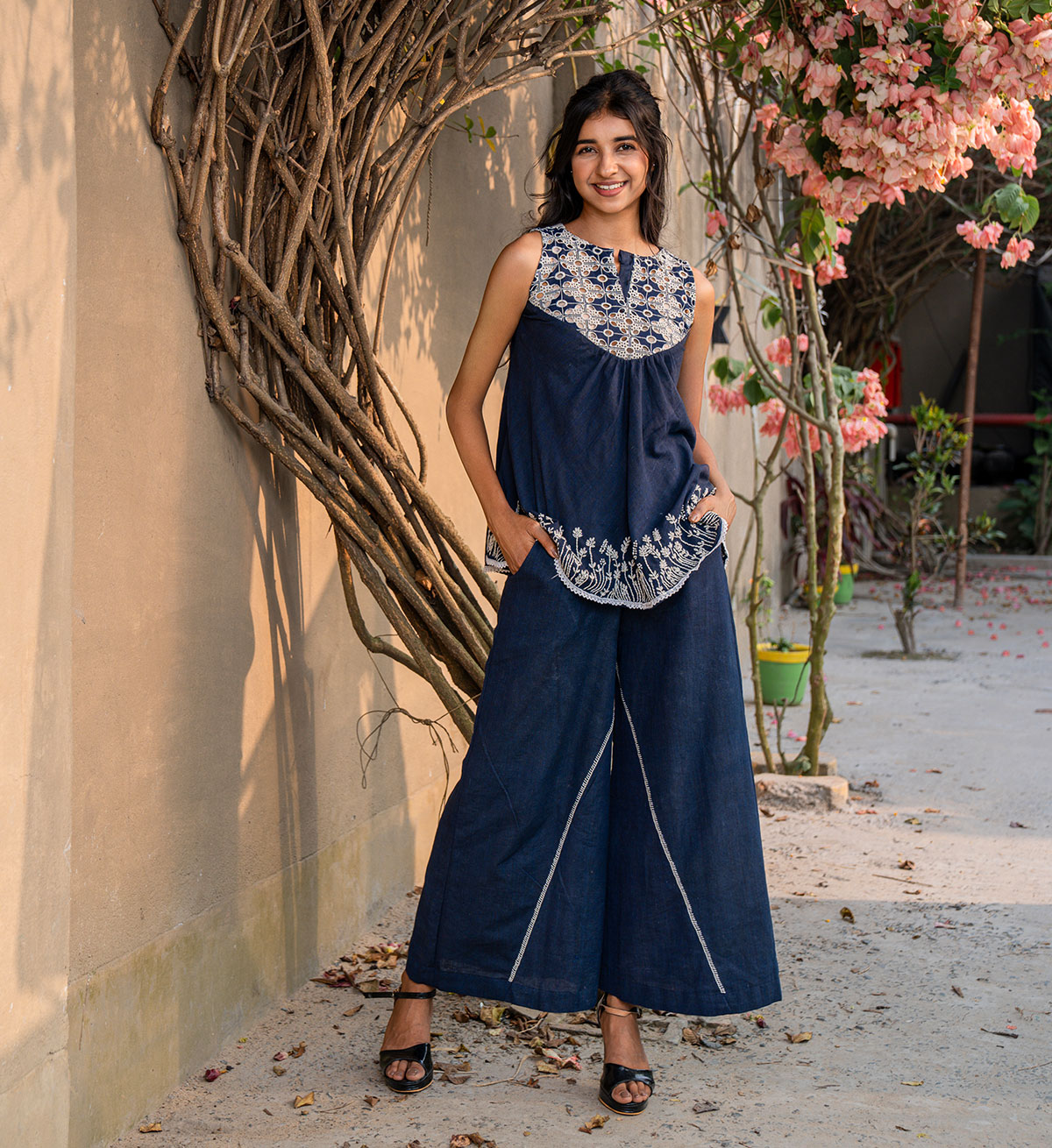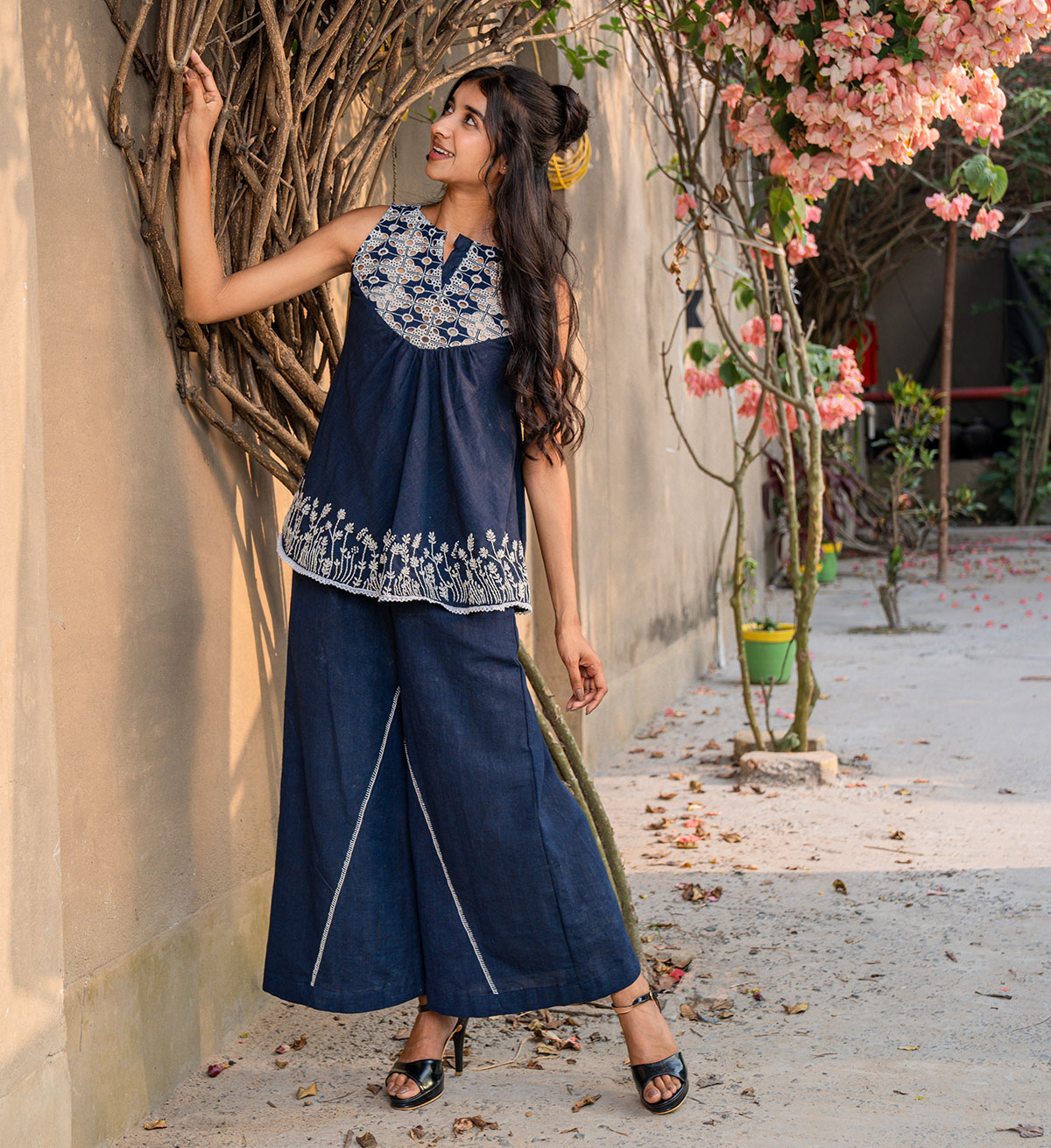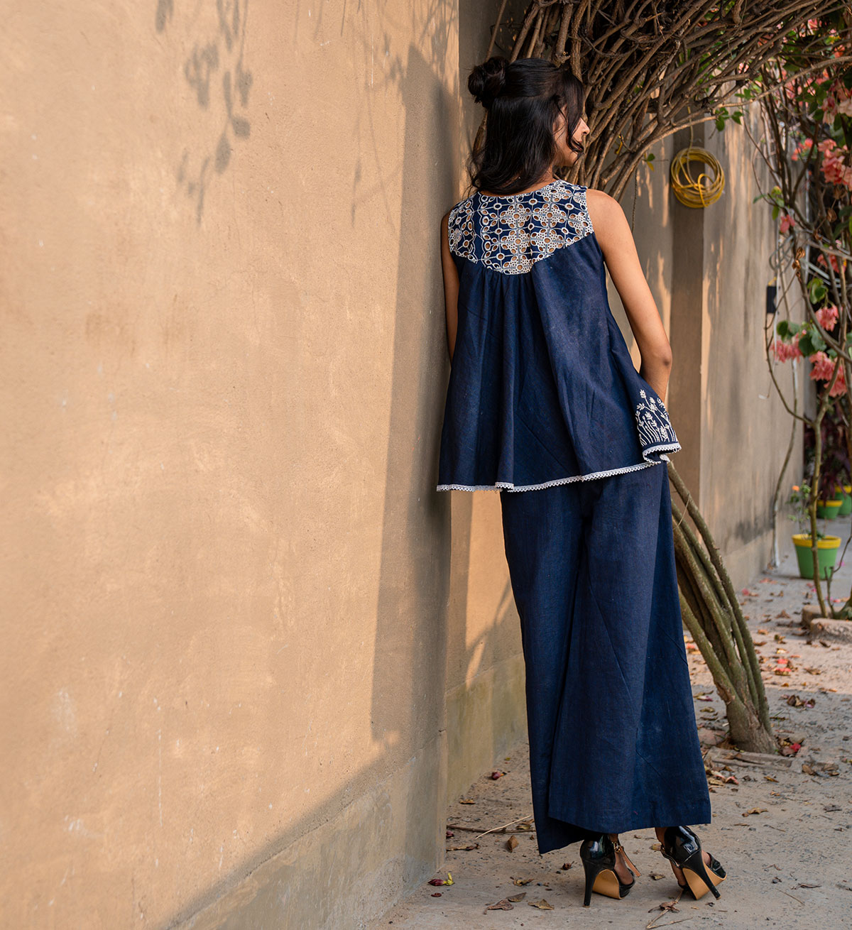 A top meant to be playful and functionally chic all together- tailored to a flary silhouette, out of denim blue cotton, with cutwork embroidery along the front and back yoke, with hand embroidered floral vines are placed carefully all over the hemline. Paired here with our flary overlapping pants that come accentuated with hand embroidery. Can be purchased as seperates as well as a set!