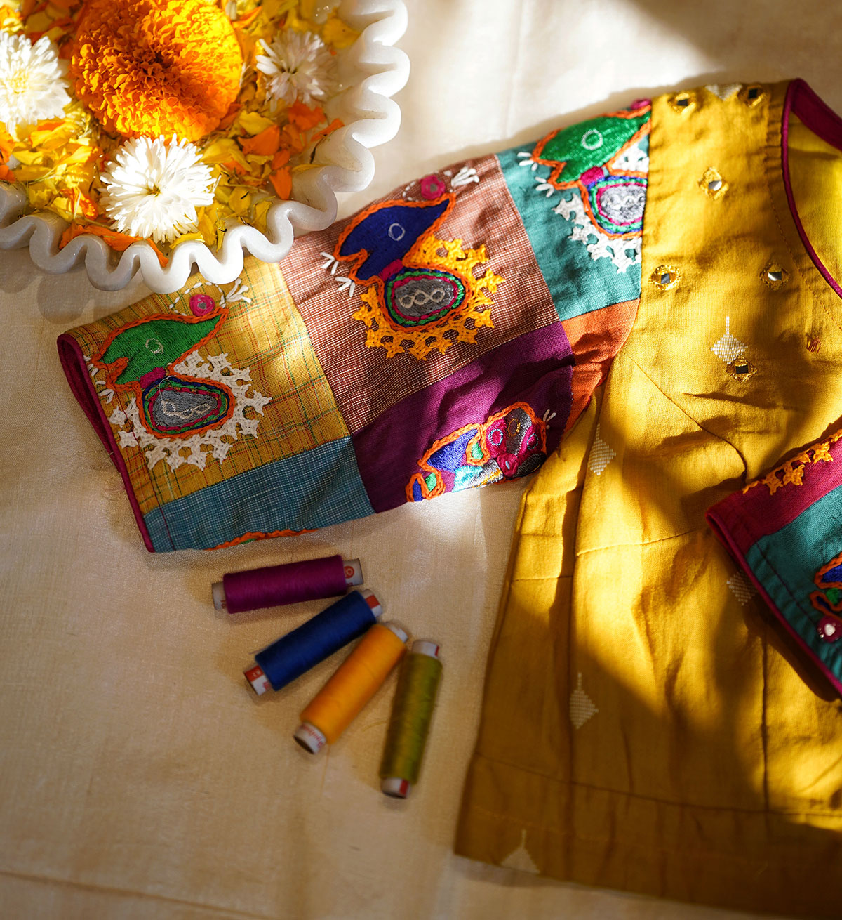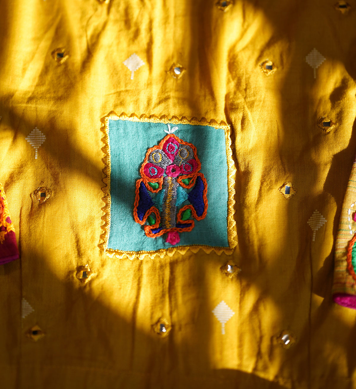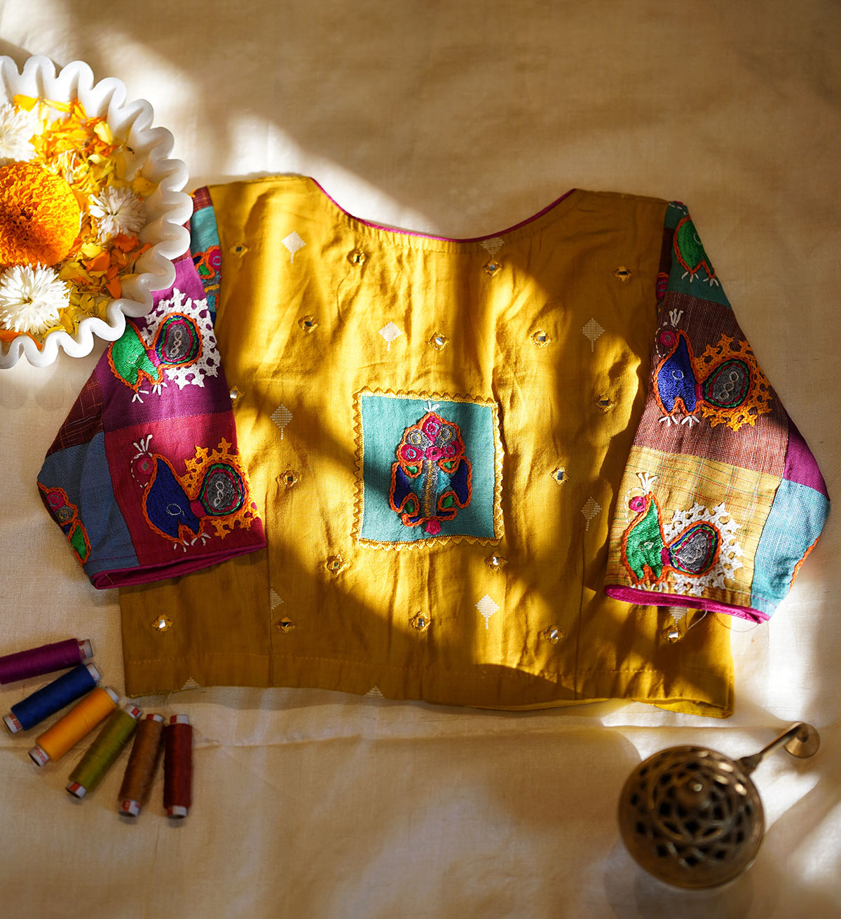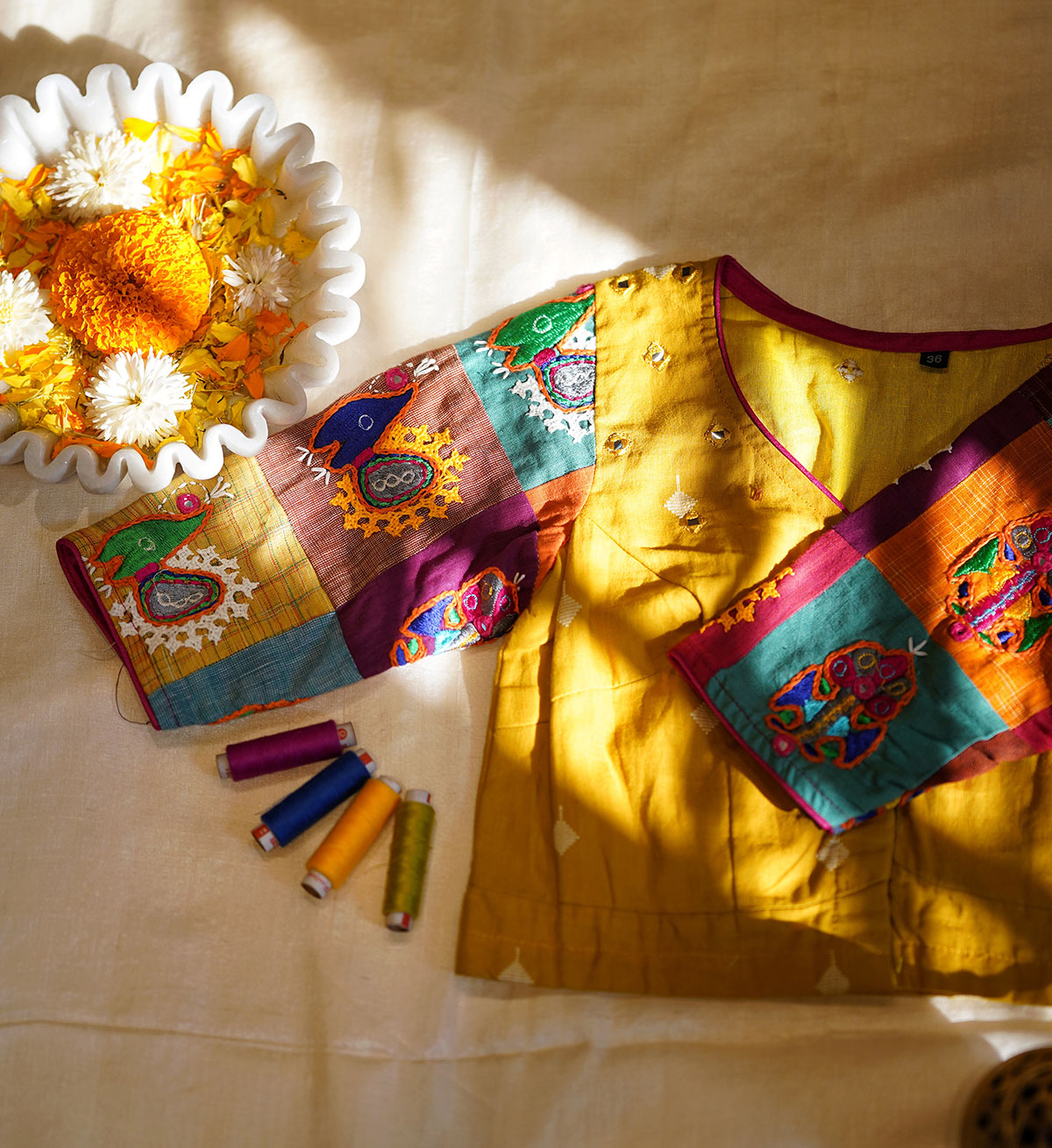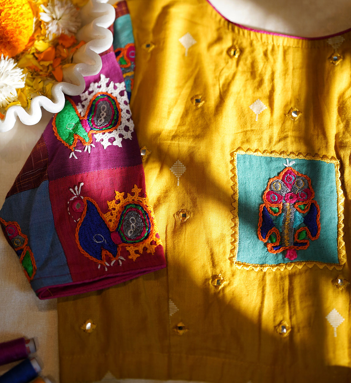 The blouse that celebrates the union of patchwork and embroidery, tailored out of handwoven cotton with heavy embroidered butis in multi colours, all over the sleeves, while a single patch adorns the back alongside accents of mirror embroidery at the back and front. The motifs of the embroidery is inspired from the traditional, tribal artform of ‘Rabari’ embroidery, and is our humble tribute to this ancient craft from Kutch, Gujarat.