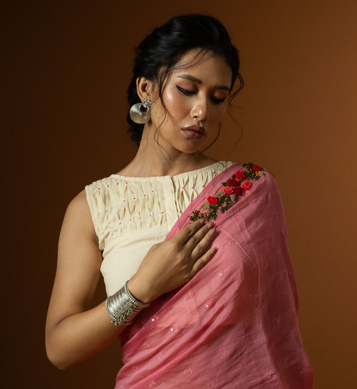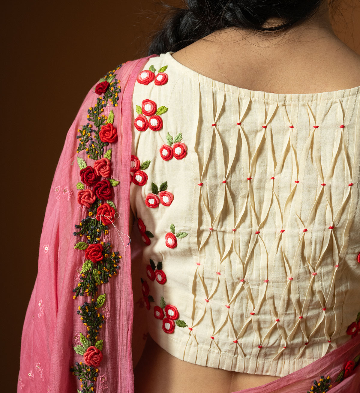 Off white pure cotton blouse adorned with hand embroidery- with front hook closure, the front neckline and the back features carefully done honeycombing, with hand embroidered floral motifs and french knots carefully placed to enhance the beauty further. Can be customised with sleeves on order.