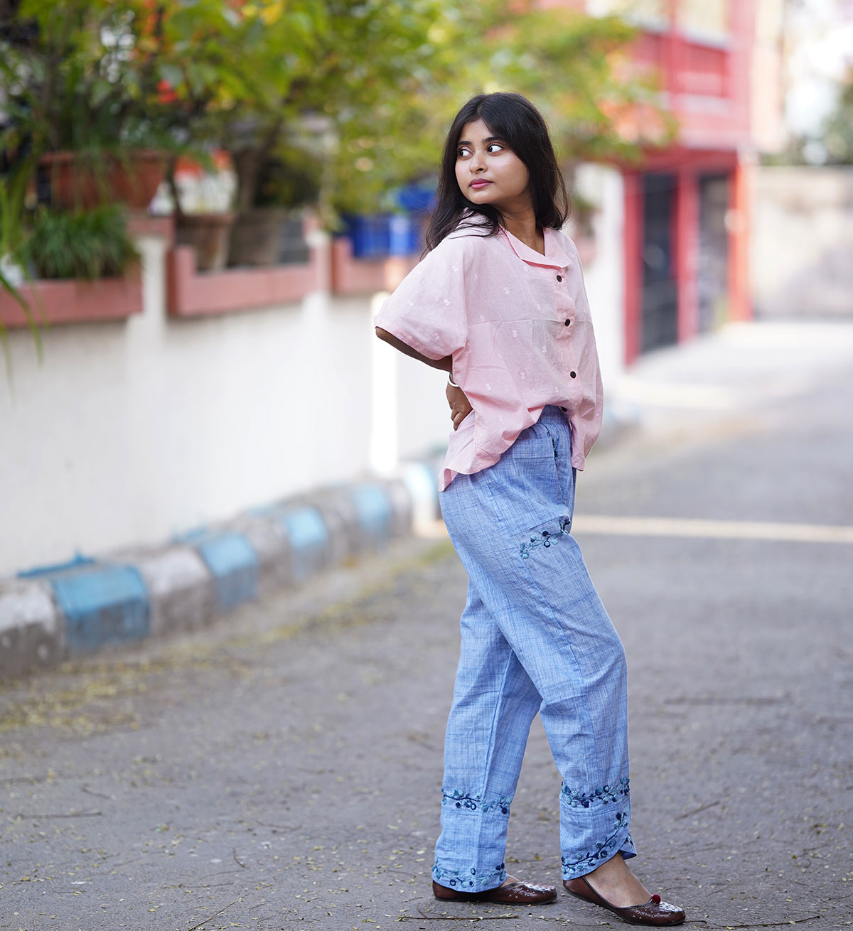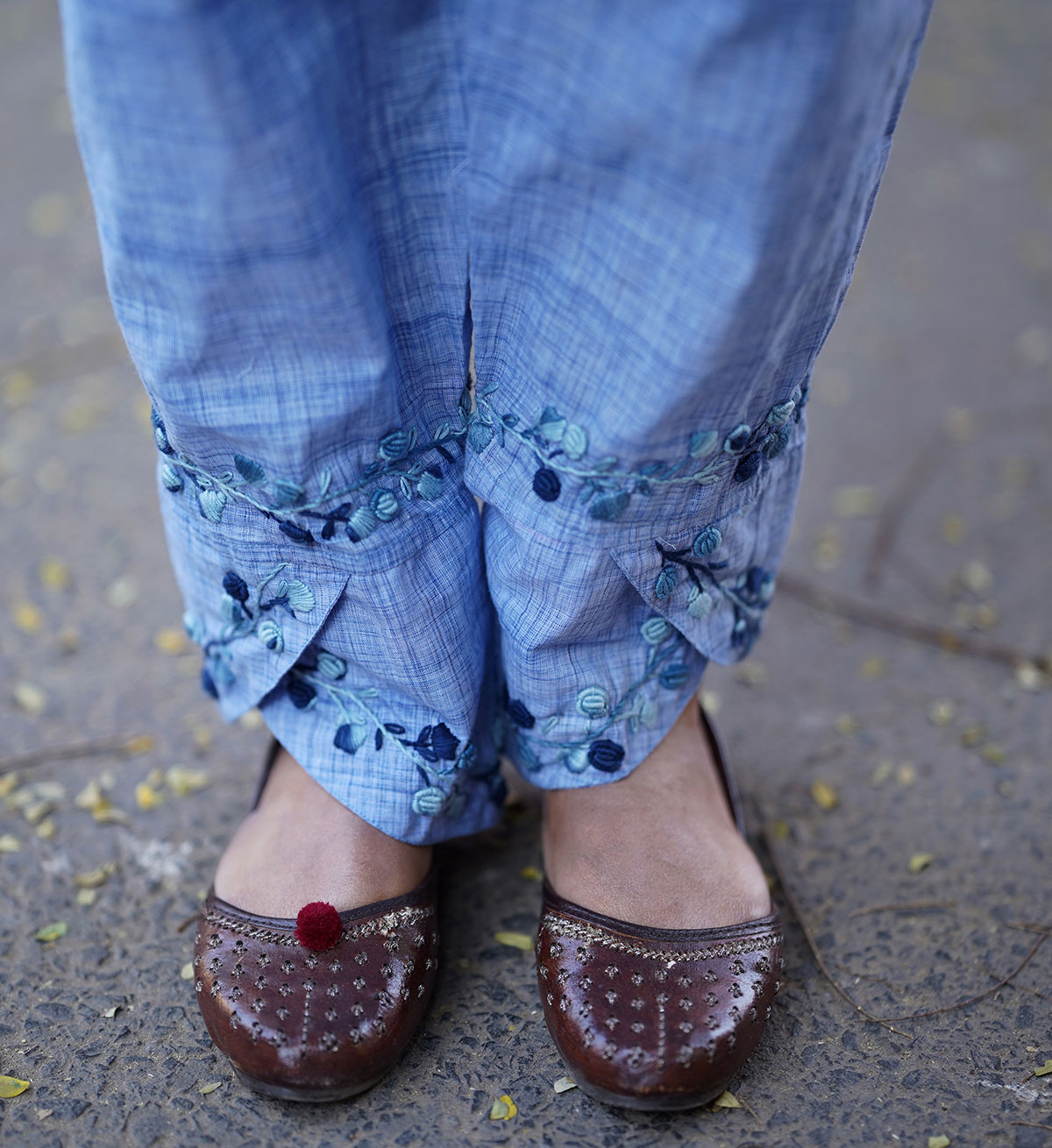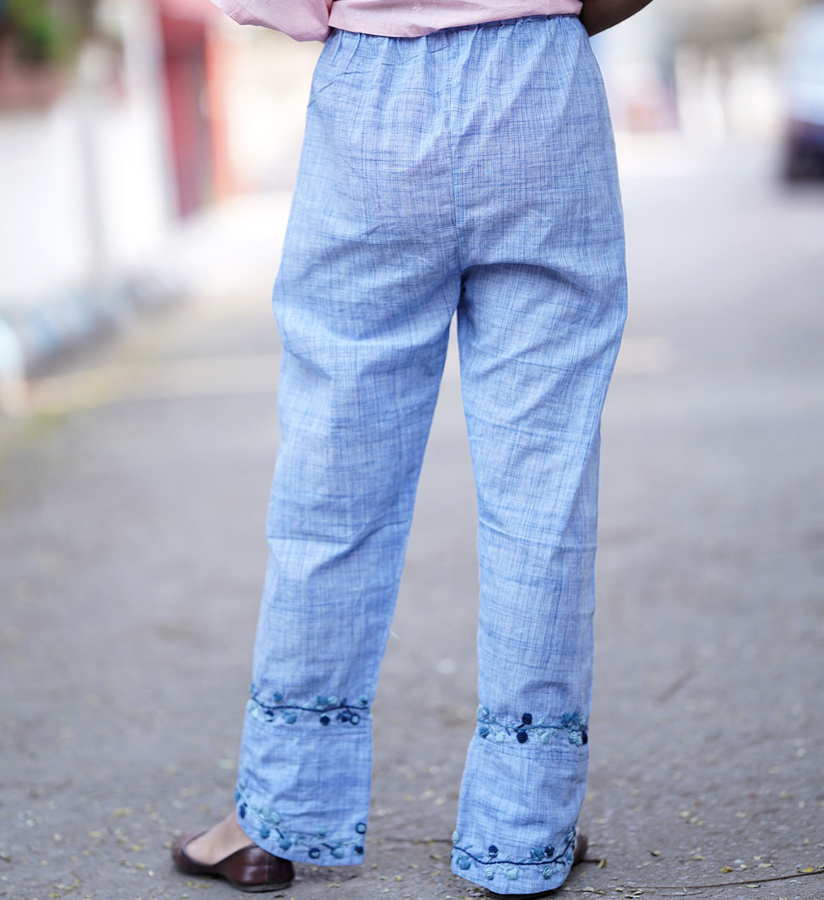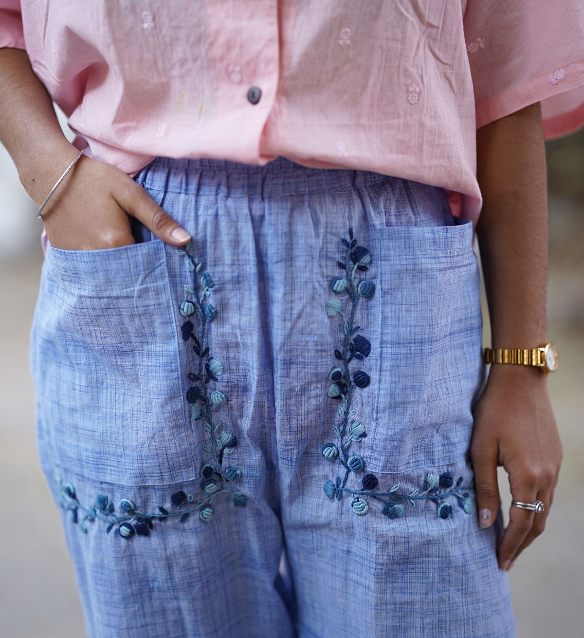 Hand woven spun cotton pants tailored to perfection in an elegant dual toned powder blue shade, adorned with dainty vines of hand embroidered flowers along the pockets and tulip hemline – with an elastic waistband to ensure maximum comfort, here’s our pick to elevate your everyday styling game with unique simplicity!