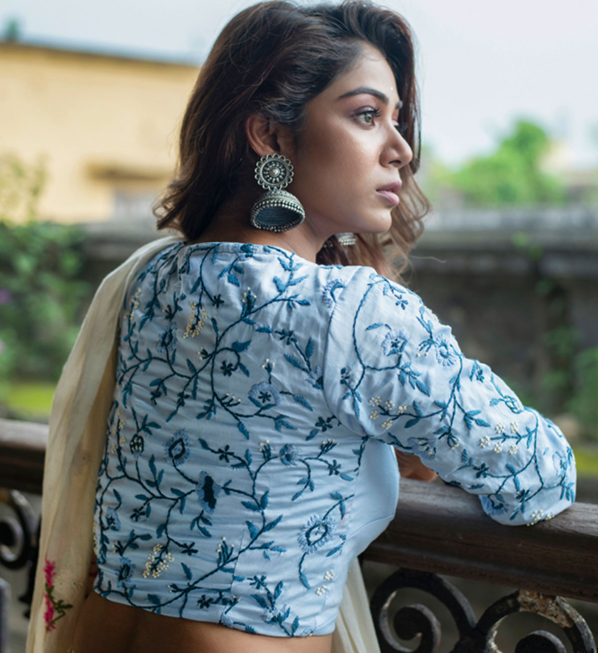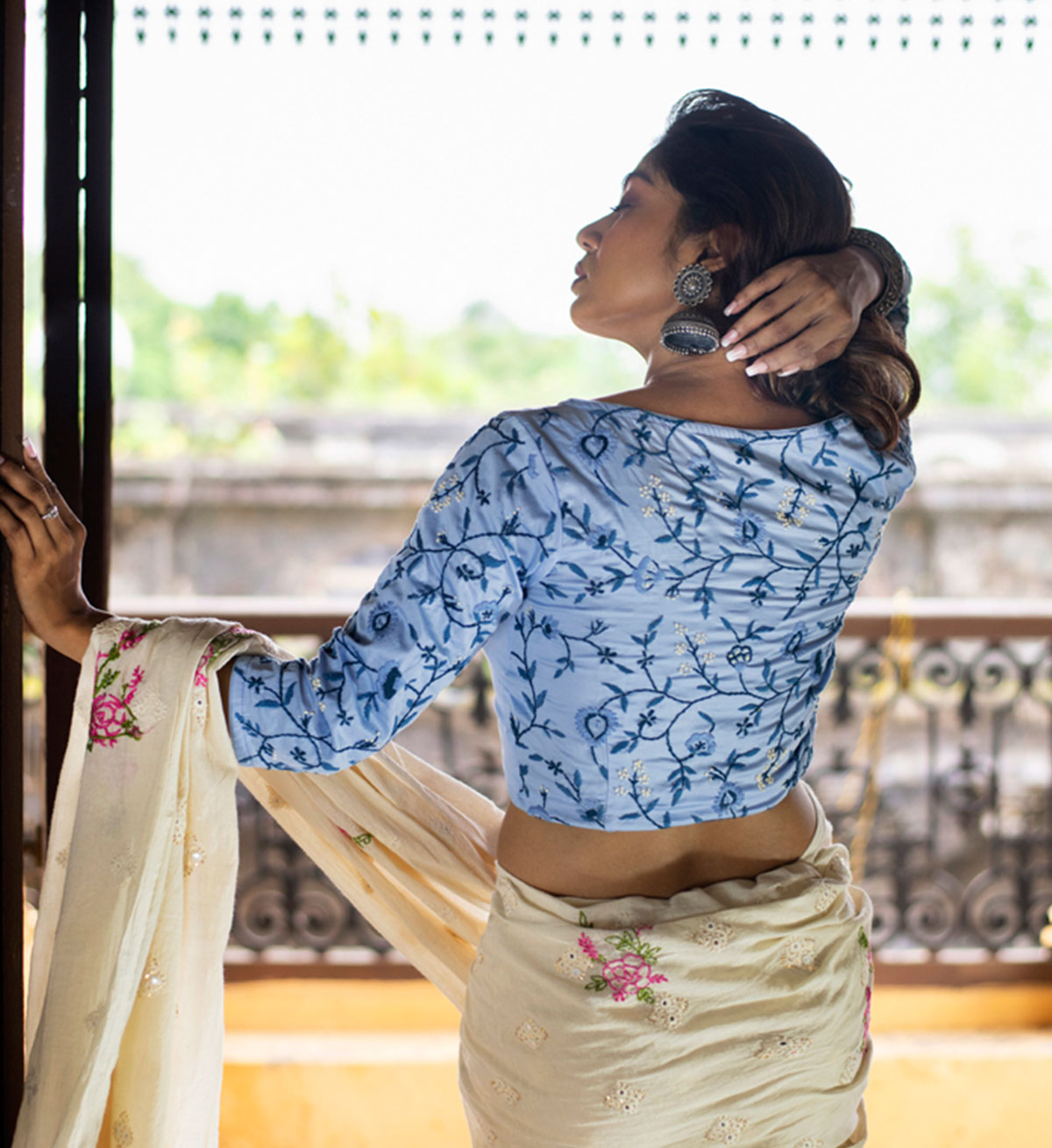A classic for all seasons, this blouse is crafted out of pure handwoven hand woven spun cotton. The beautiful light blue base is adorned with our rendition of Chikankari, hand embroidered in shades of dark blue and white in a full jaal pattern all over the back and sleeves, with a dainty front neckline and front hook closure.
