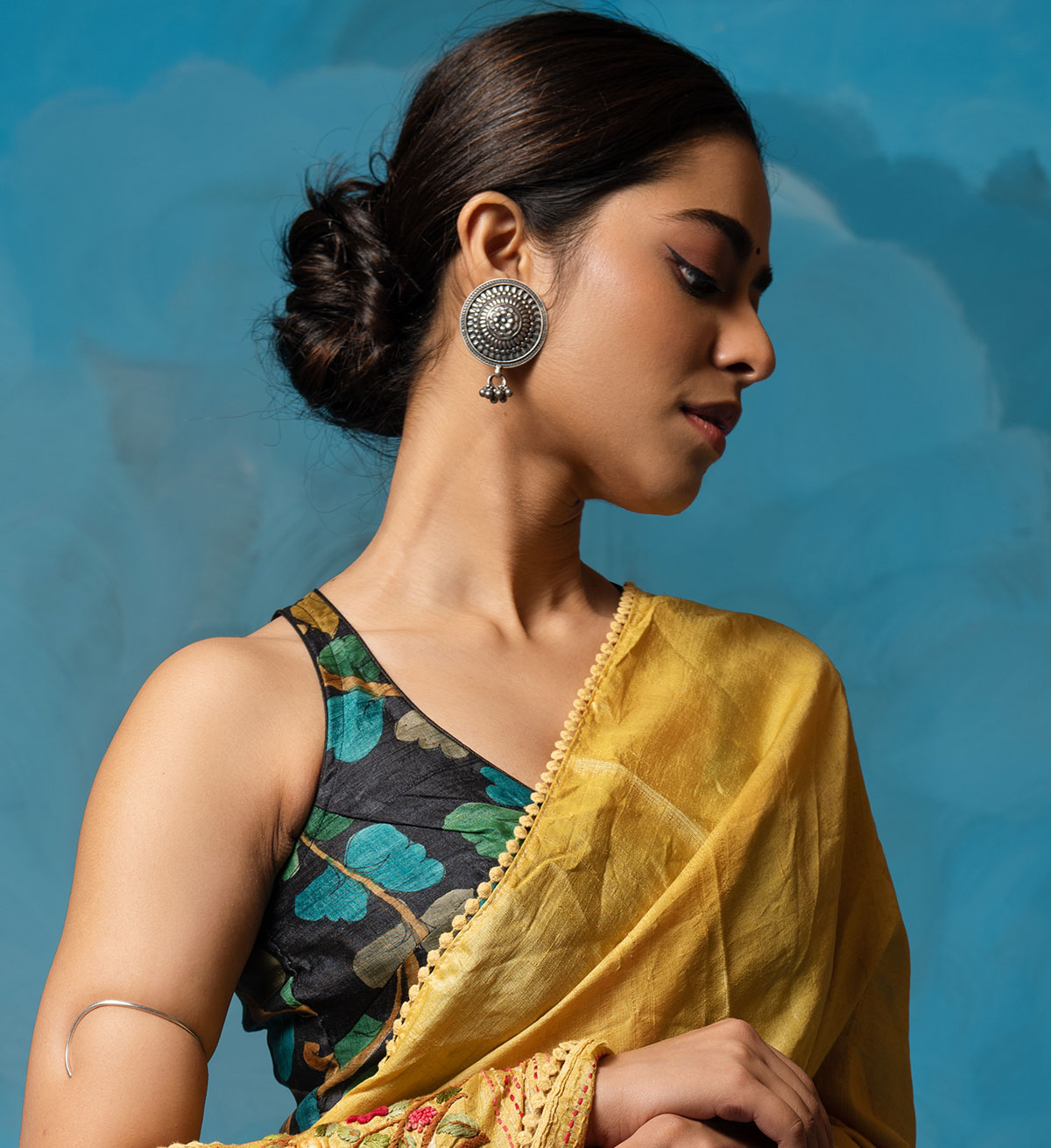 Pure handspun, handwoven tussar silk blouse tailored out of handcrafted floral pen kalamkari in shades of green,yellow and black- with a sleek front neckline and a racerback silhouette at the back. Can be customised with sleeves on order.