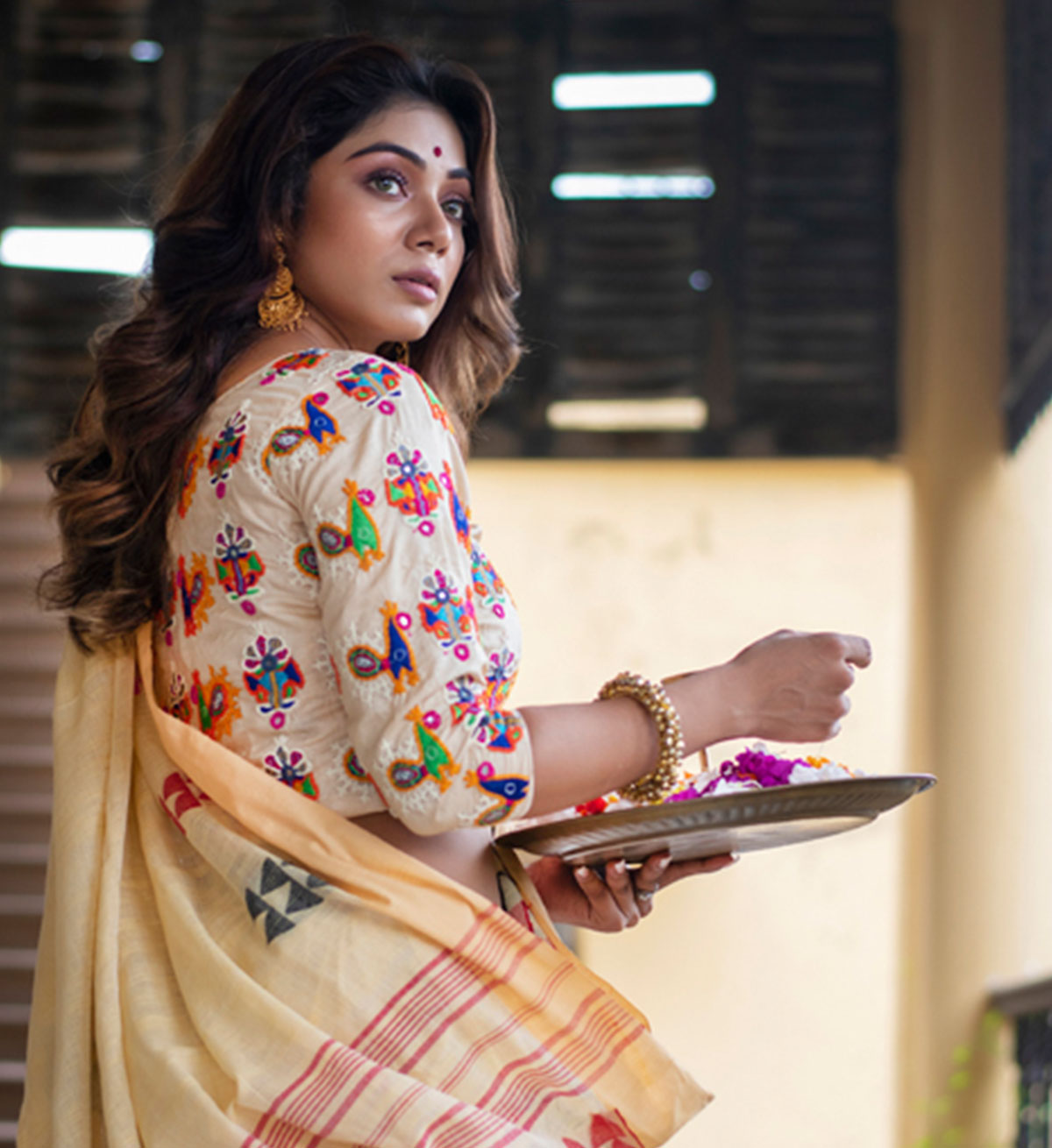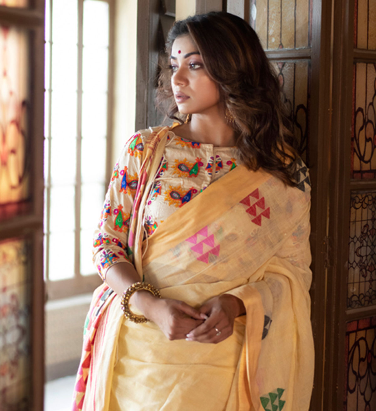 Classic handspun, handwoven tussar blouse tailored to perfection, with heavy embroidered butis in multi colours, and front hook closure.The motifs of the embroidery is inspired from the traditional, tribal artform of ‘Rabari’ embroidery, and is our humble tribute to this ancient craft from Kutch, Gujarat.