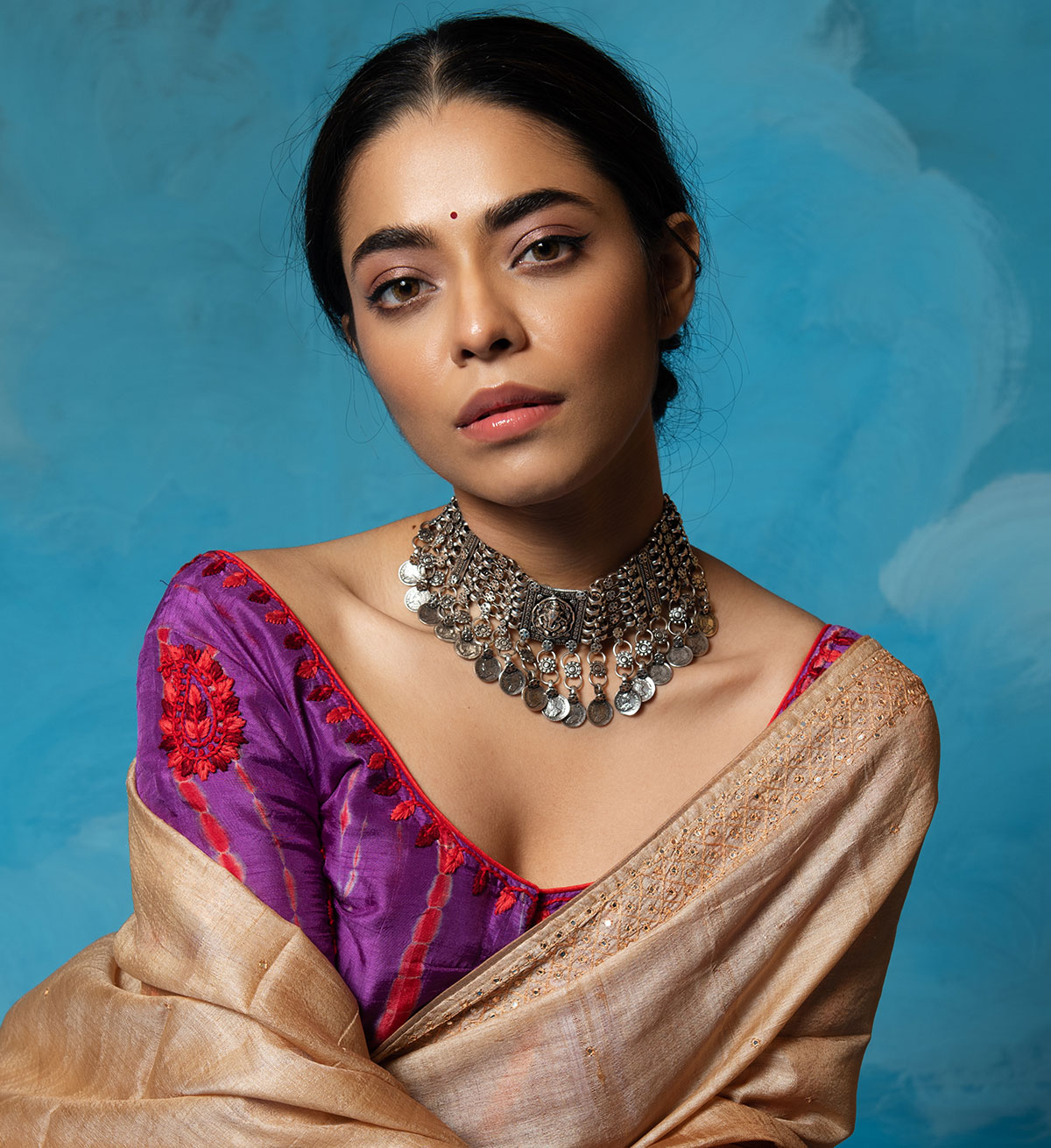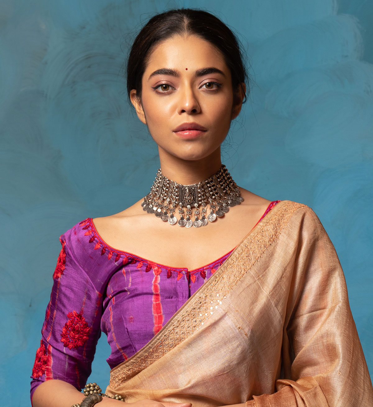 Pure handspun, handwoven tussar blouse that celebrates the painstakingly done technique of Shibori in a red and purple palette- with front hook closure, enhanced by hand embroidered detailing along the neckline and paisley motifs on the sleeves.
