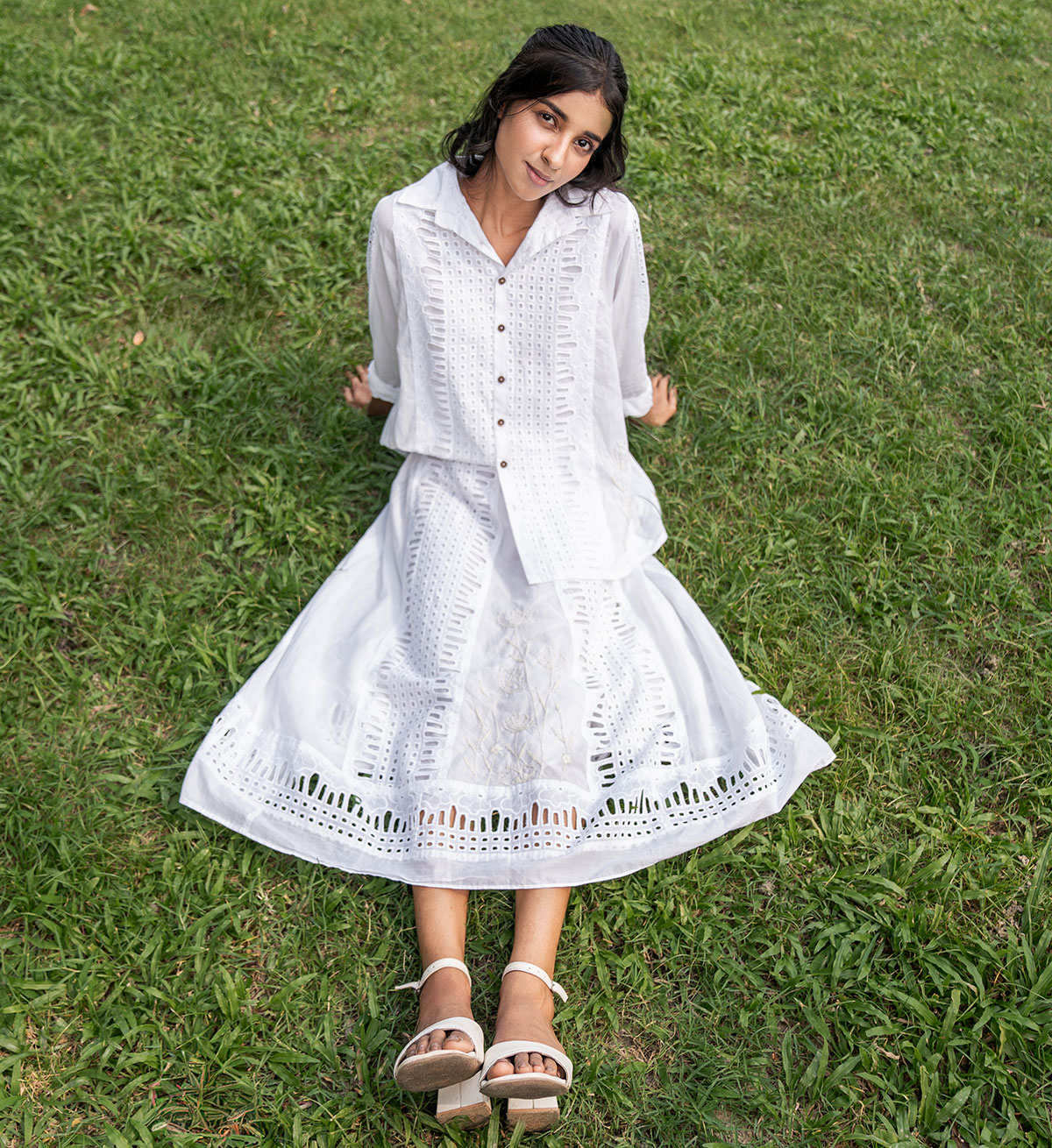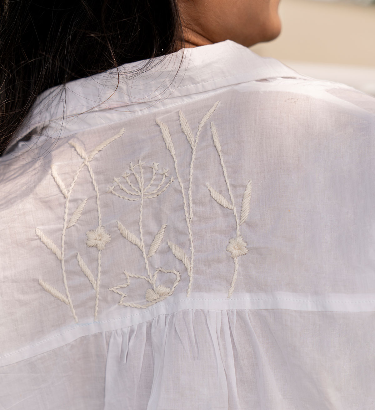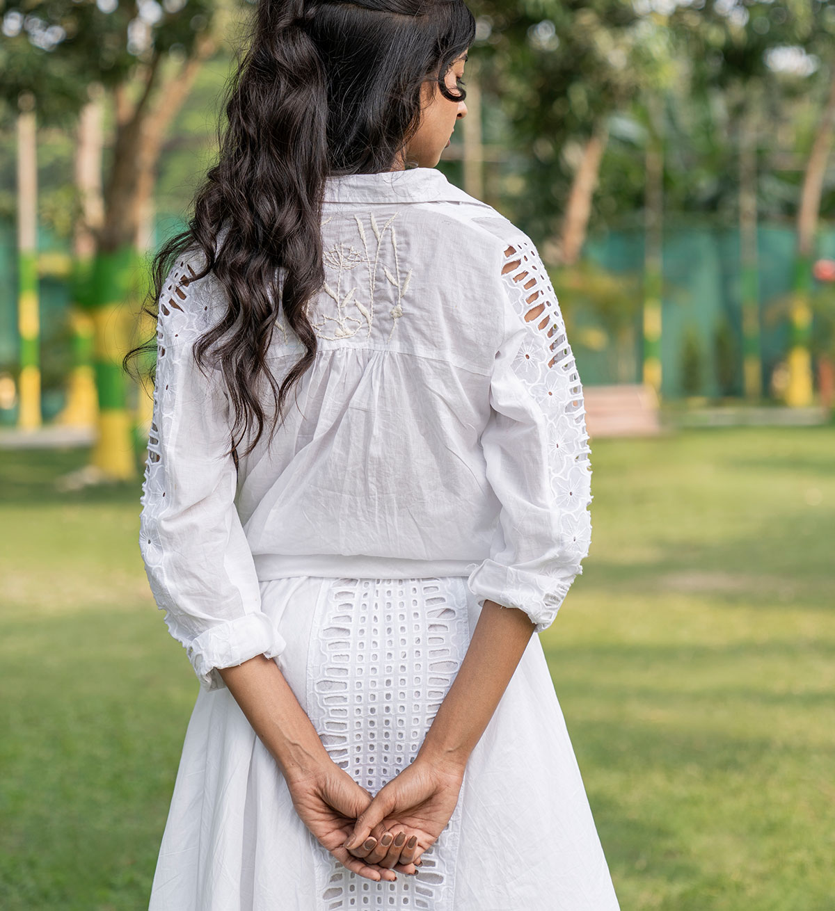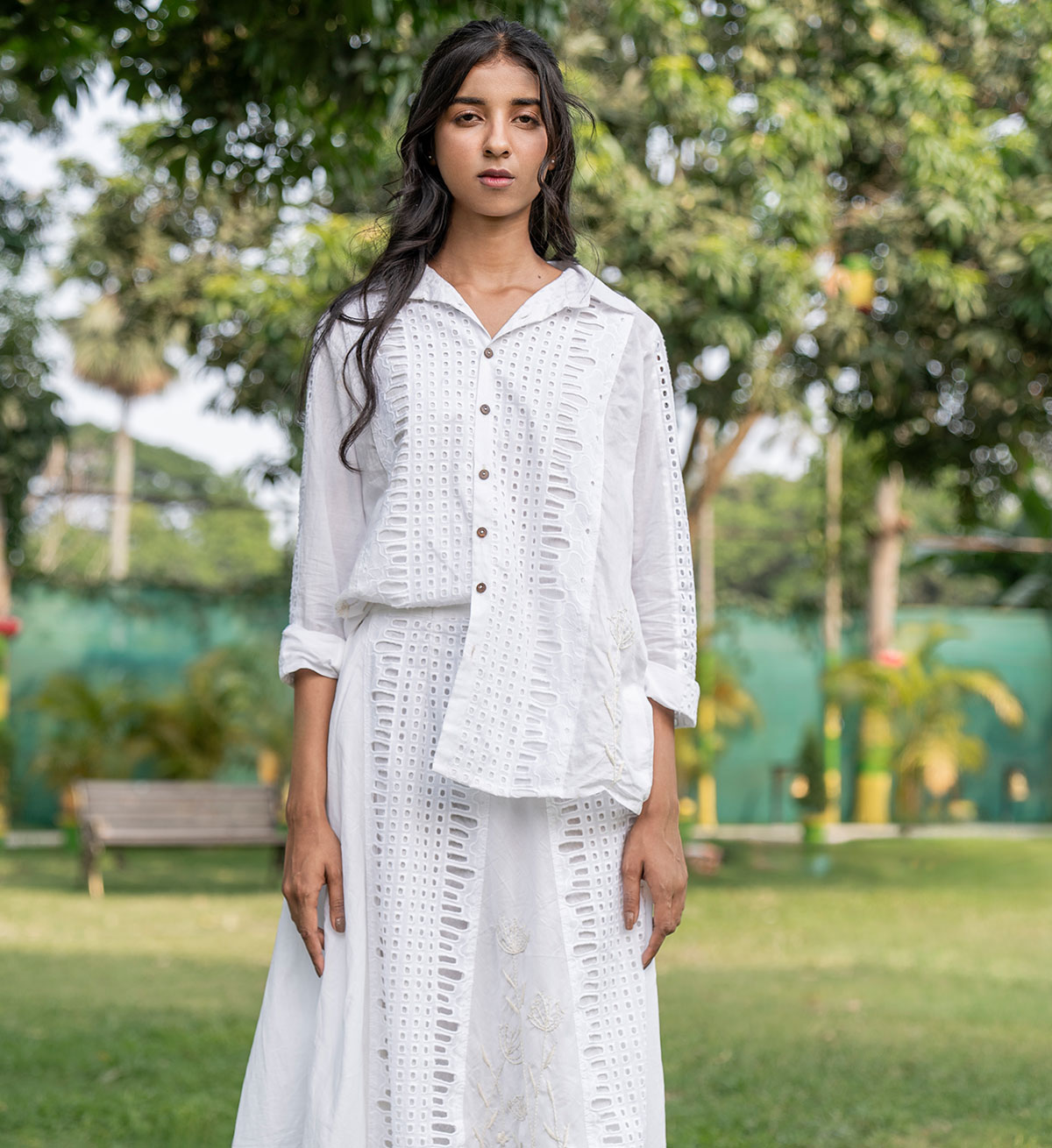 Soft cotton shirt tailored out of pristine white, in a classic silhouette- with parallel panels of hakoba placed carefully at the front and sleeves, along floral hand embroidery at the back. Paired here with our Hakoba panelled skirt. Can be purchased as seperates as well as a set!