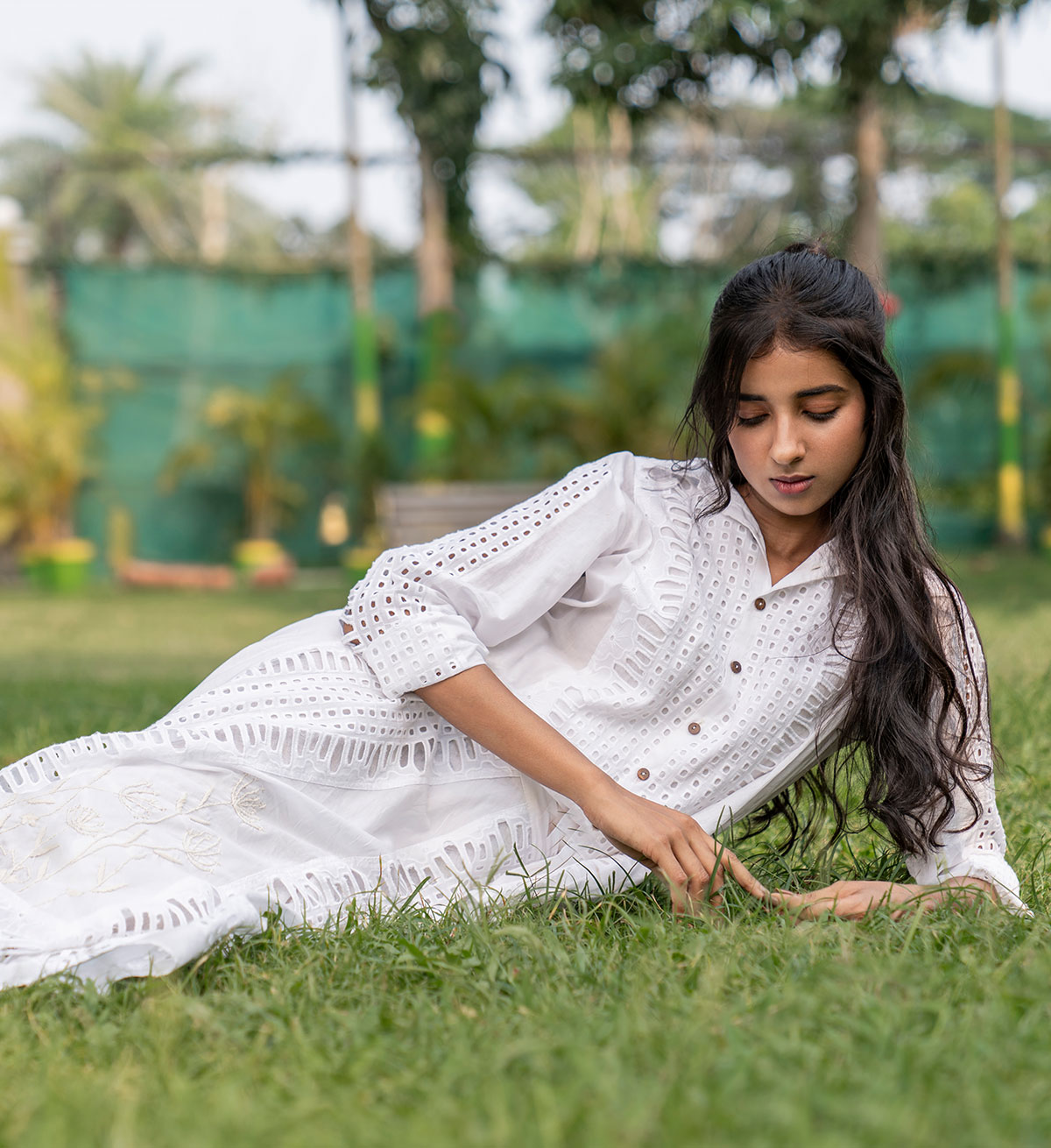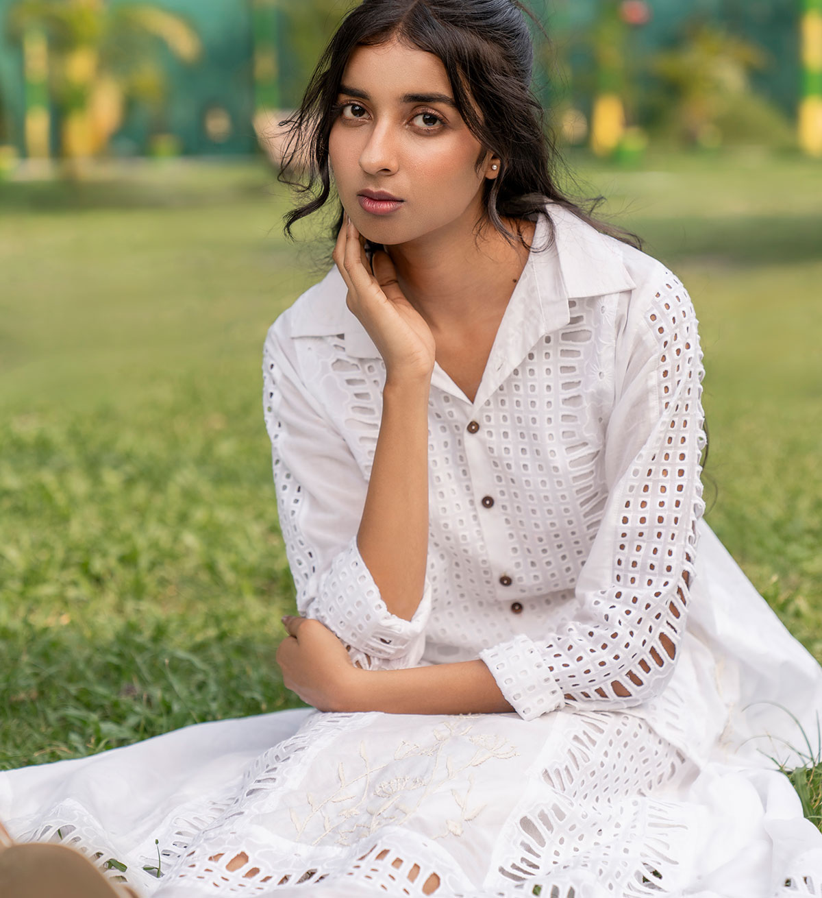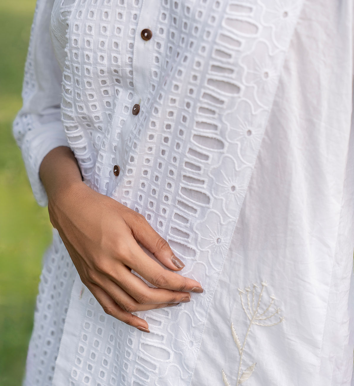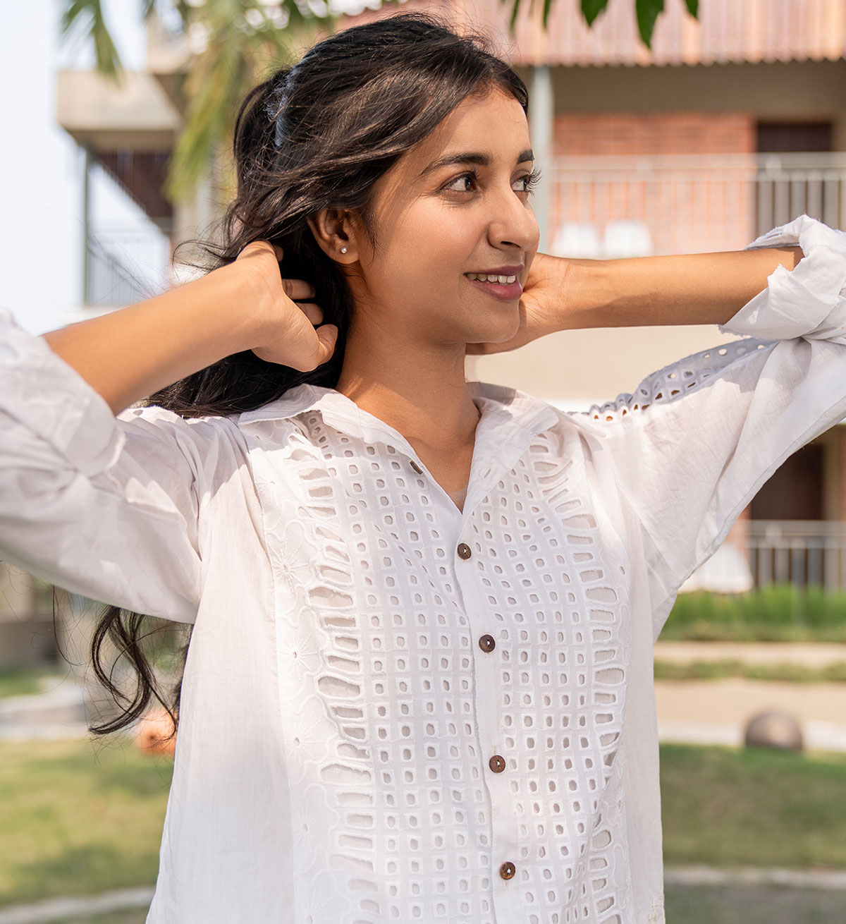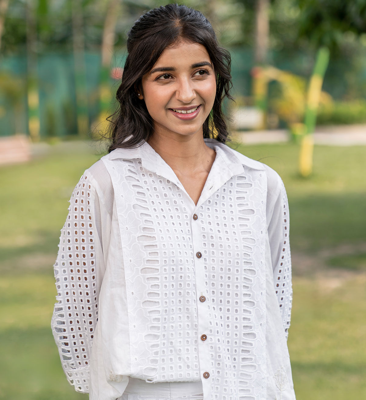Soft cotton shirt tailored out of pristine white, in a classic silhouette- with parallel panels of hakoba placed carefully at the front and sleeves, along floral hand embroidery at the back. Paired here with our Hakoba panelled skirt. Can be purchased as seperates as well as a set!