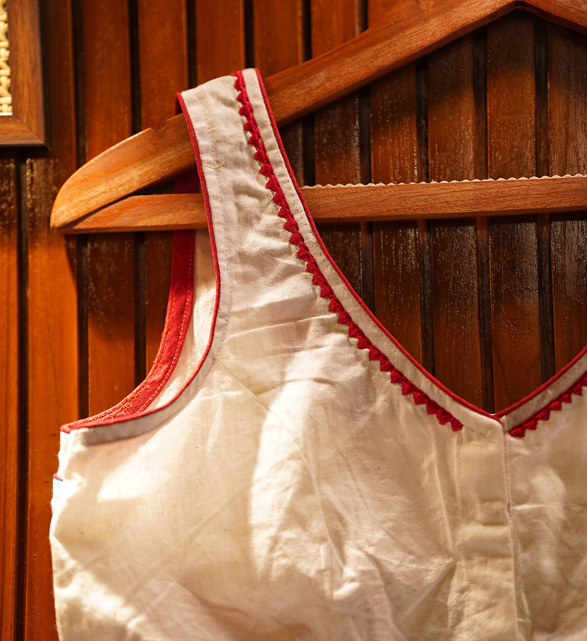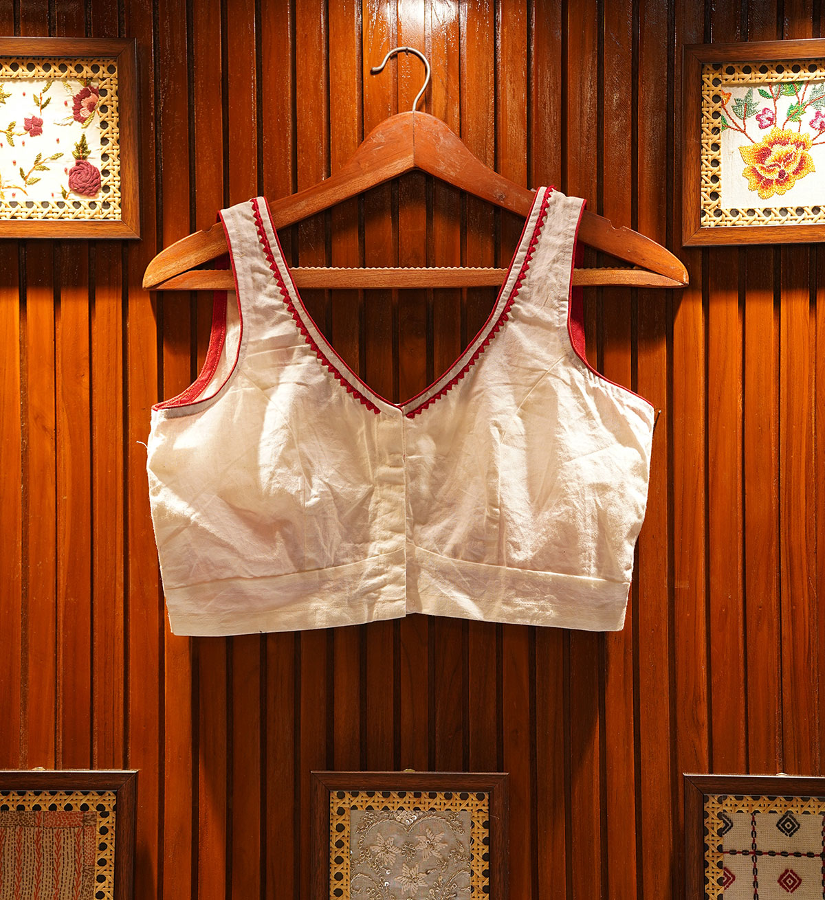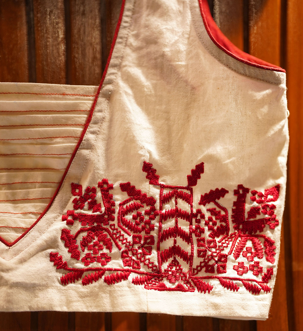 Classic cotton blouse in an evergreen ‘laal-shaada’ combination. The front comes with a sleek embroidered neckline and hook closure, while the back is adorned with pleated detailing and embroidery inspired from the traditional Jamdani motifs. Sleeves can be added on order. Please contact us if you want them stitched.